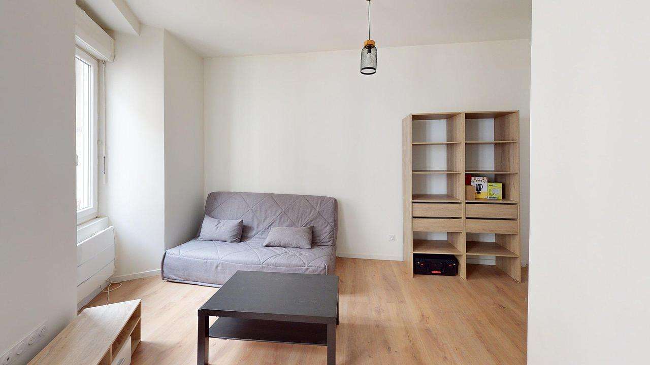 Le studio offre une pièce de vie lumineuse grâce à ses deux grandes fenêtres donnant sur la rue. L’espace est aménagé avec un canapé convertible, une table basse et un meuble de rangement ouvert, permettant d’organiser facilement son quotidien.