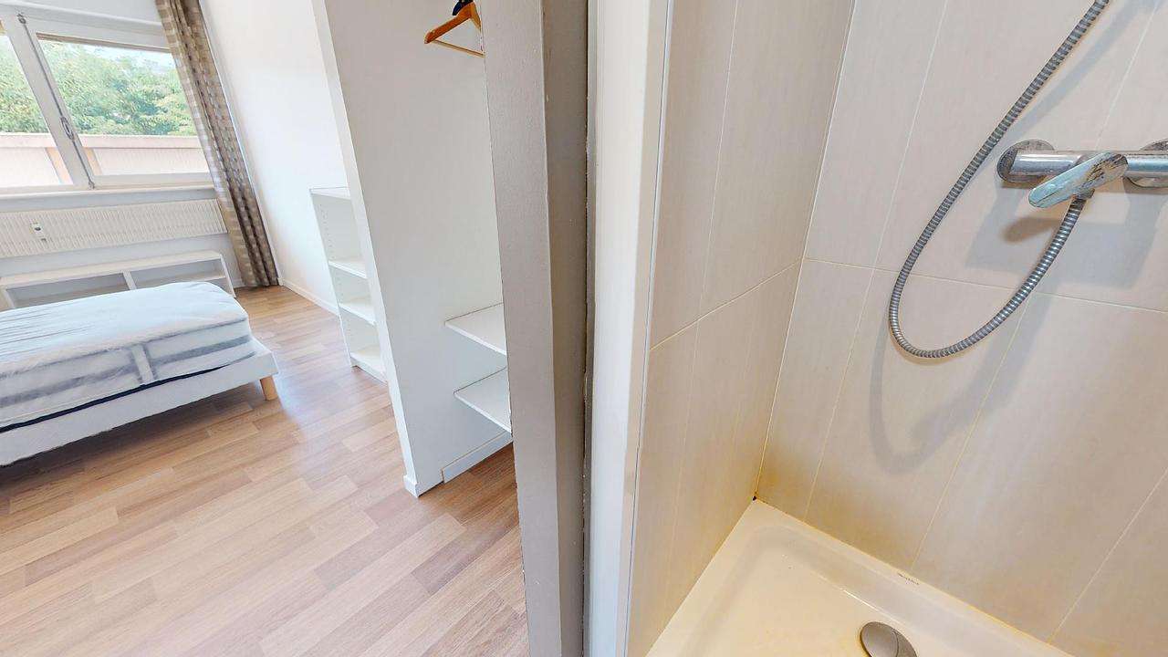 Chaque chambre dispose d'un lit simple, bureau, espaces de rangement ainsi qu'une salle de bain privative avec douche et meuble vasque.