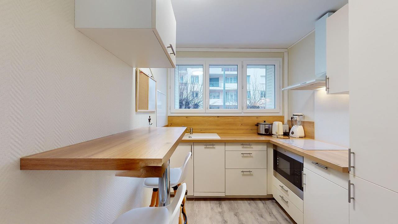 Juste en face, une cuisine parfaitement aménagée vous propose une plaque de cuisson surmontée d’une hotte, un four, un évier, un réfrigérateur avec congélateur, un lave vaisselle, un mange debout complété et de nombreux rangements.