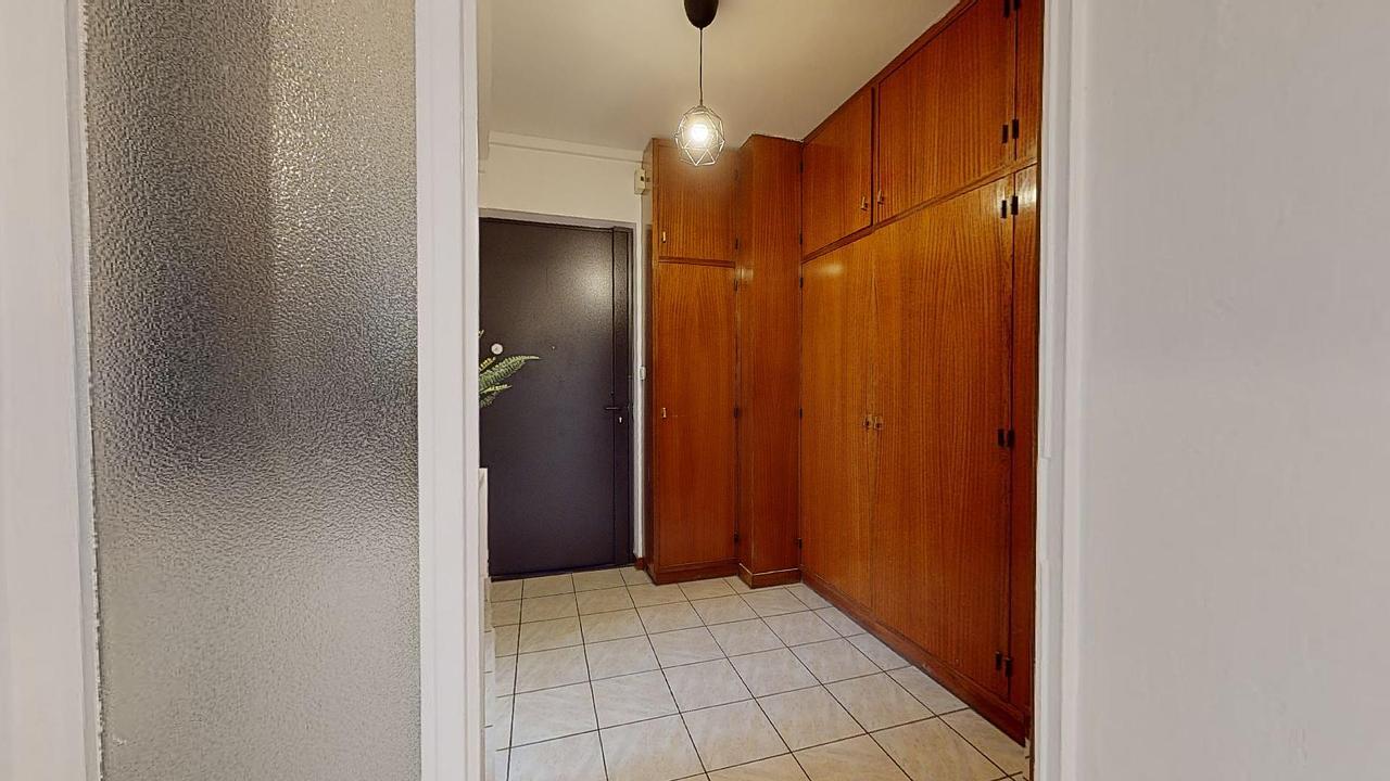 L'entrée de ce logement donne sur un couloir doté de nombreux rangements, offrant un accès à la pièce principale.