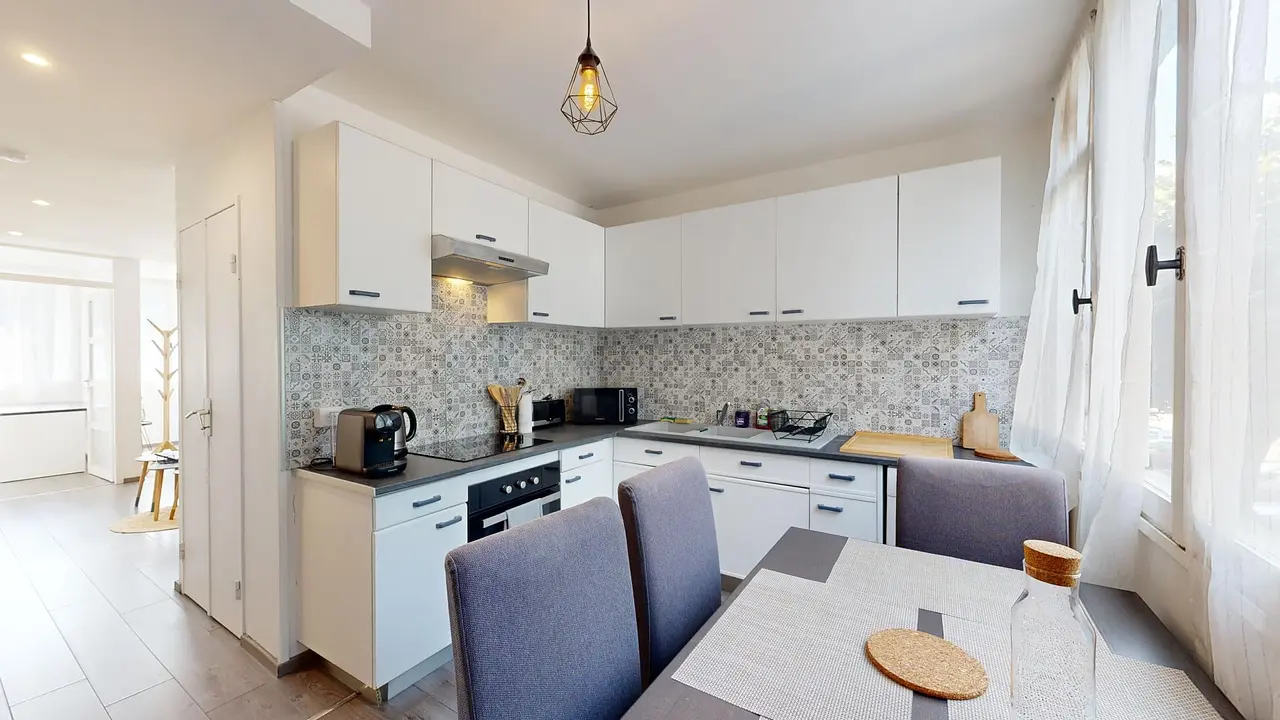 Une cuisine avec une machine à café, un micro-ondes, des plaques de cuissons, une hotte, un four, un évier, une machine à laver, une table à manger avec ses chaises ainsi qu'un réfrigérateur et de nombreux rangements.