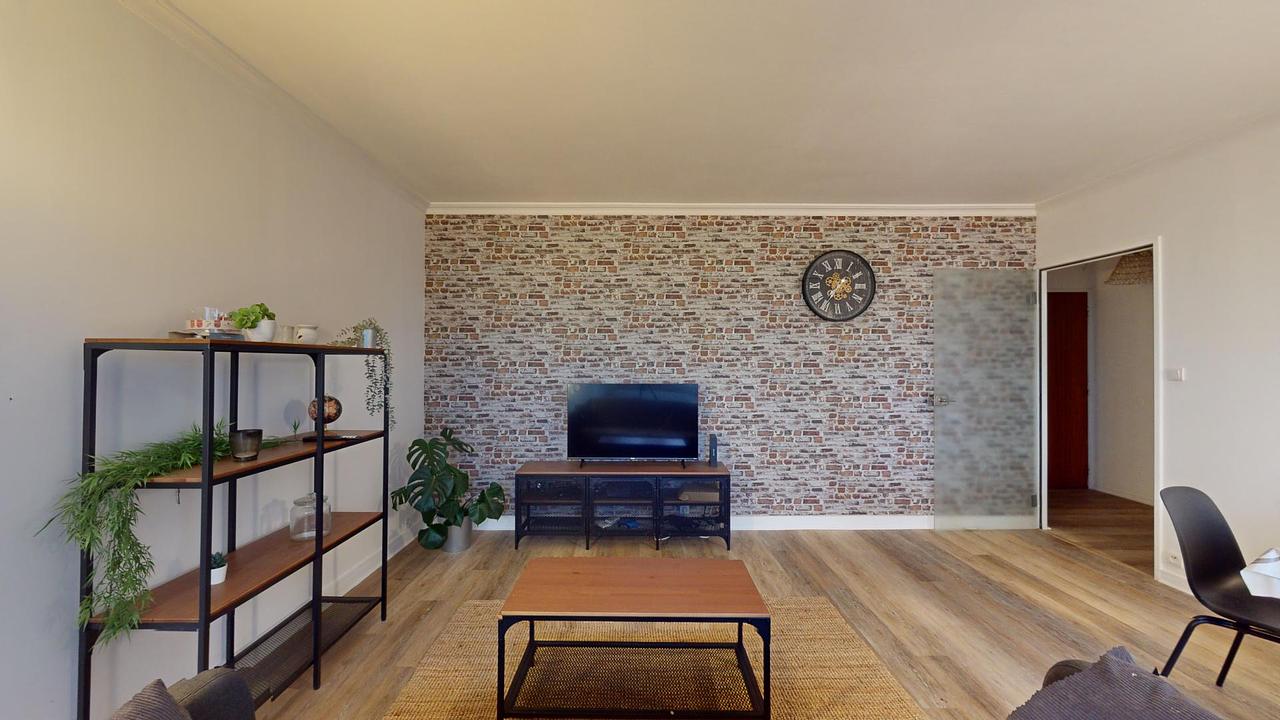 Un salon équipé d'un canapé, d'une table basse, d'un meuble Tv avec sa télévision et une table à manger. Une grande porte-fenêtre menant sur le balcon illumine cette pièce.