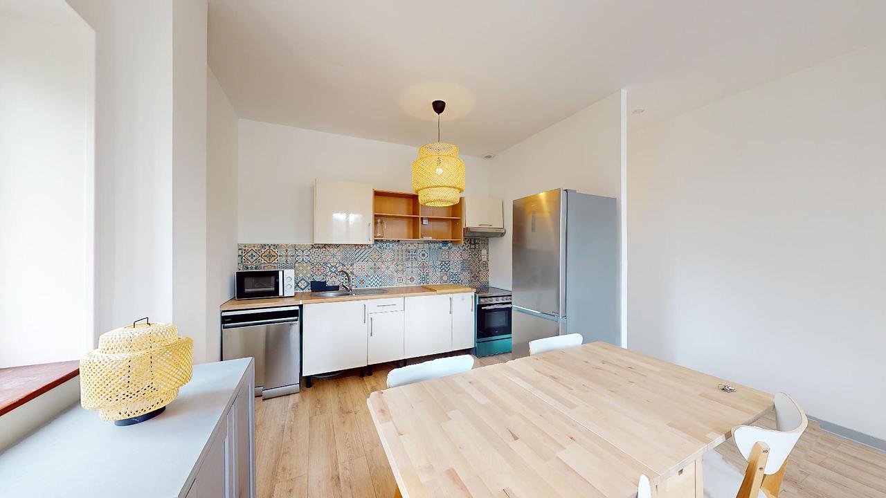 Cette colocation, composée de trois chambres, offre une spacieuse pièce de vie comprenant à la fois un coin salon et une cuisine.