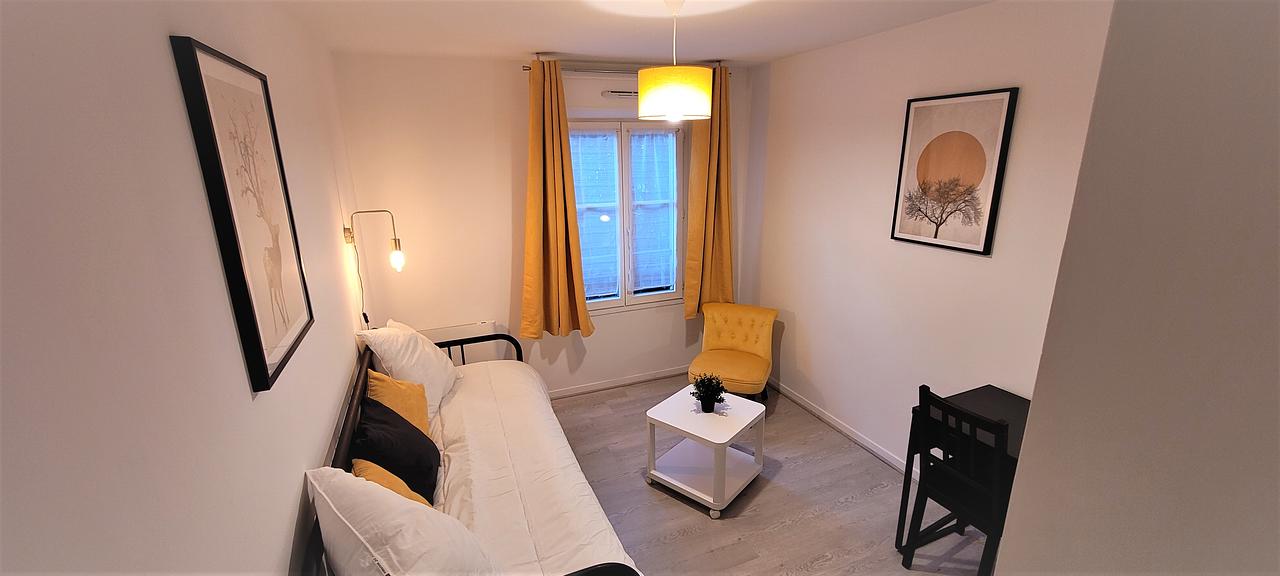 Chambre 3 "Jaune Velours": 10.92 m² Avec fenêtre, rangements, lit 2p, table basse, bureau, fauteuil, miroir… 500€