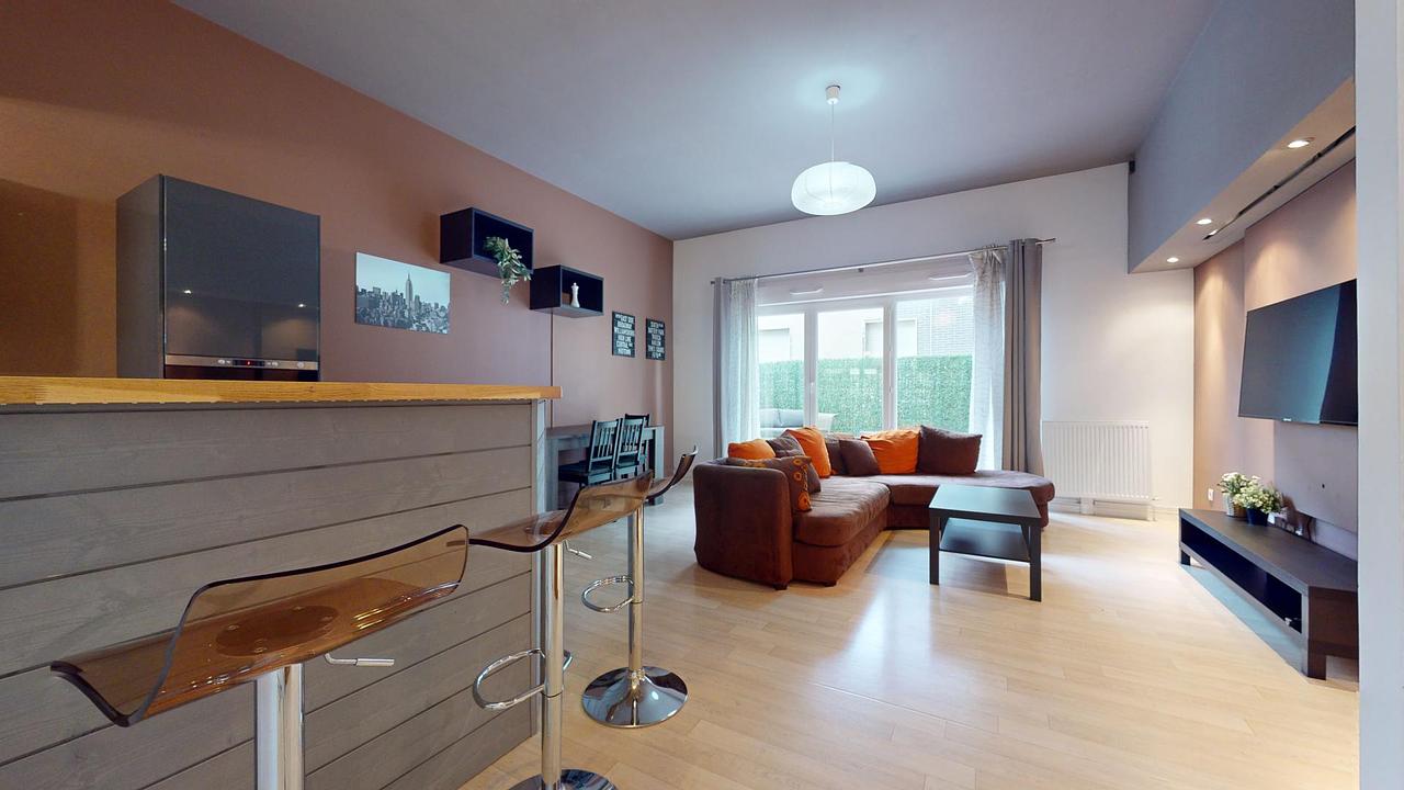 La maison s'ouvre sur une entrée avec rangements desservant un grand séjour avec cuisine ouverte. Celui-ci dispose d'un canapé, d'une table basse, d'un meuble TV, d'une TV et d'une table avec 4 chaises.