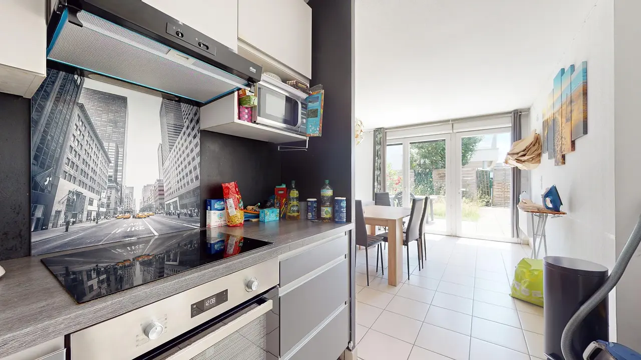 Cet appartement s'ouvre sur un séjour avec cuisine ouverte. Clui-ci dispose d'un canapé, d'une TV, de rangements et d'une table avec 4 chaises. La pièce est baignée de lumière grâce à ses deux grandes portes-fenêtres.