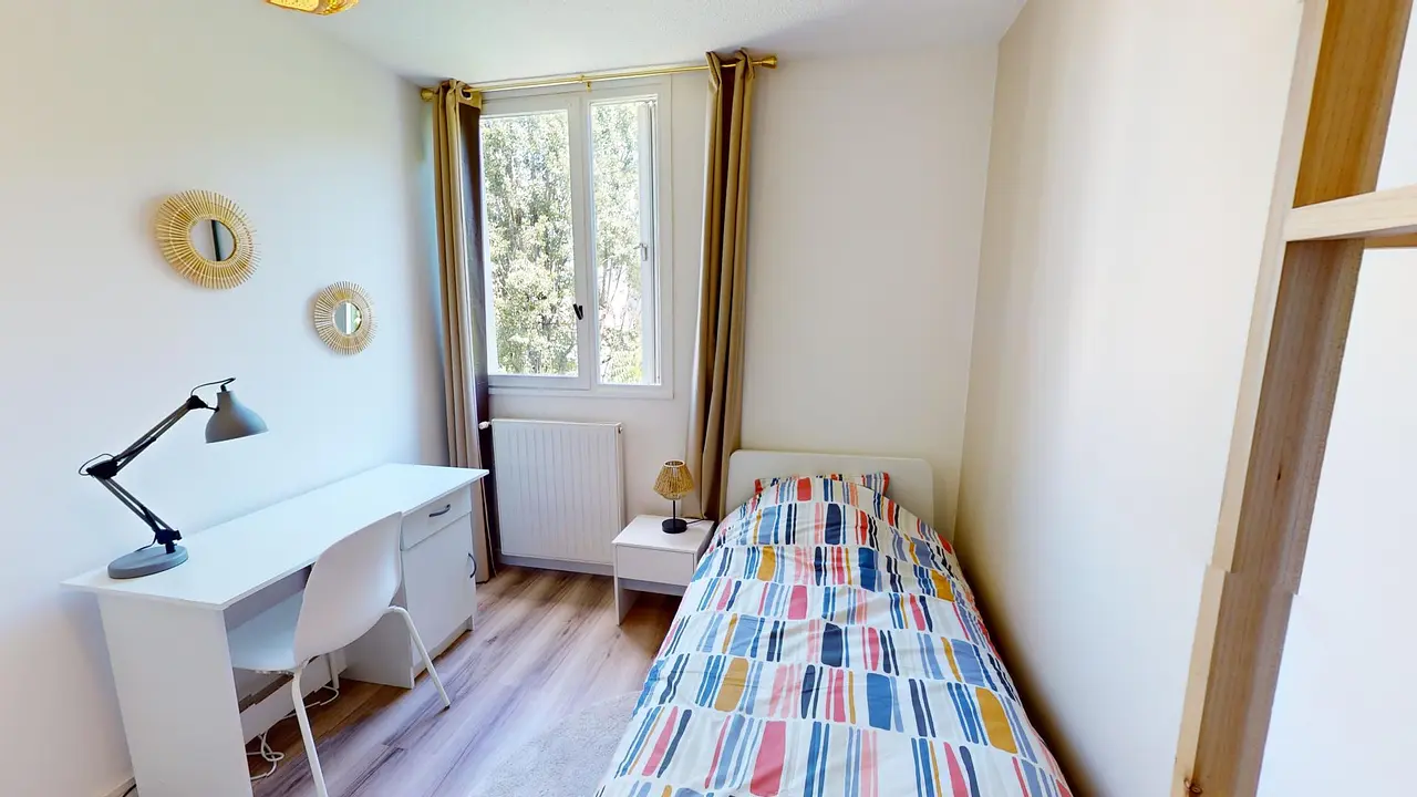La chambre (non-fumeur) est équipée d'un bureau, d'un lit simpte (90 X 200), d´un bureau, d´un miroir, et d'un placard. Une salle d'eau privative équipée d'une douche, d'un meuble vasque, d'un sèche-serviette électrique et d'un miroir vient compléter cette chambre. Une fenêtre vient donner de la clarté à cette pièce. La porte de la chambre comprend une serrure avec clé individuelle.