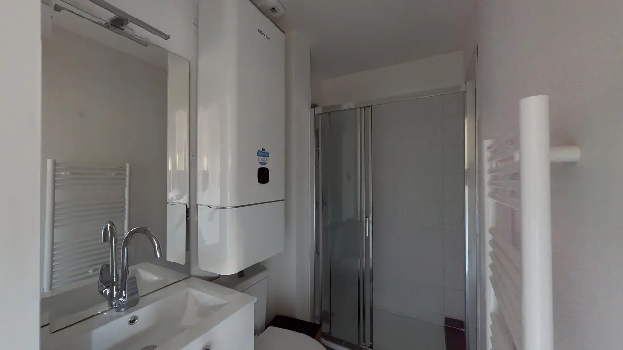 La salle d'eau dispose d'une grande douche, d'un meuble vasque avec un miroir, d'un sèche-serviettes ainsi que d'un WC.