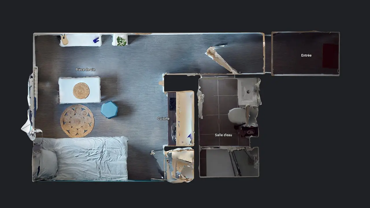 Ce studio s'ouvre sur une pièce de vie aménagée d'un lit gigogne convertible en lit deux places, d'une table basse, d'un meuble TV et d'un meuble à étagères. La cuisine ouverte est équipée d'un petit réfrigérateur, d'un micro-ondes, de plaques de cuisson avec une hotte, d'un évier ainsi que des rangements.