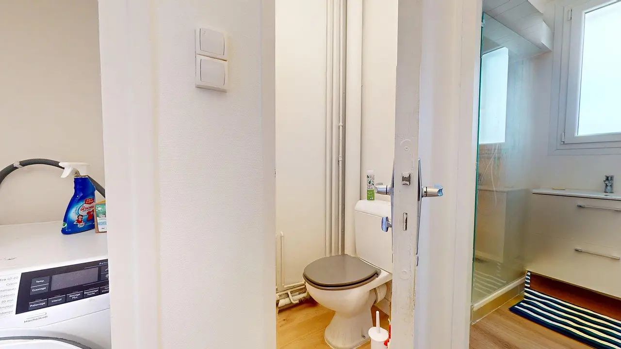 La salle d’eau est équipée d’une douche, d’un meuble vasque avec miroir et de rangements. Les WC sont séparés pour plus de confort.