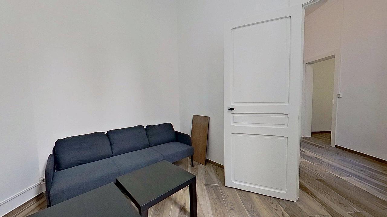 Cette colocation de trois chambres s'ouvre sur une pièce de vie aménagée d'un canapé, de deux tables basses et d'un fauteuil.
