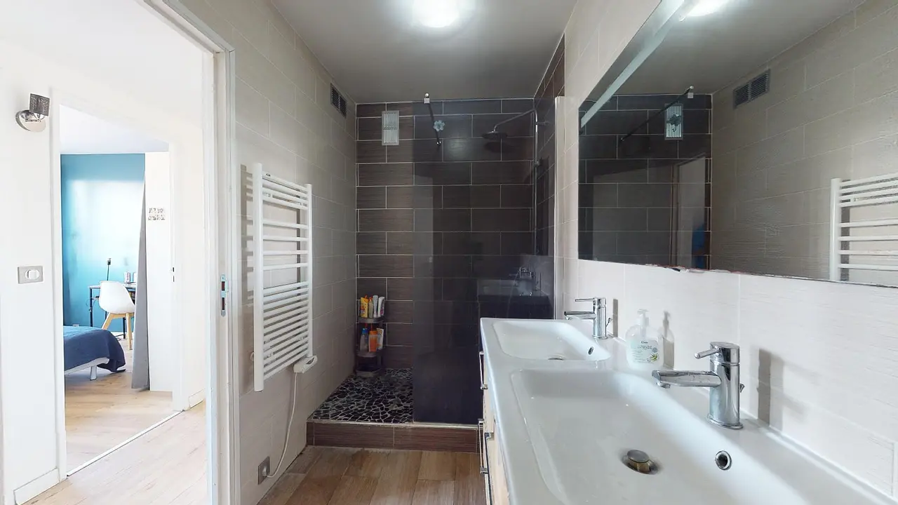 La grande salle de bain dispose d'un meuble double vasque avec un grand miroir, une grande douche ainsi qu'une baignoire!