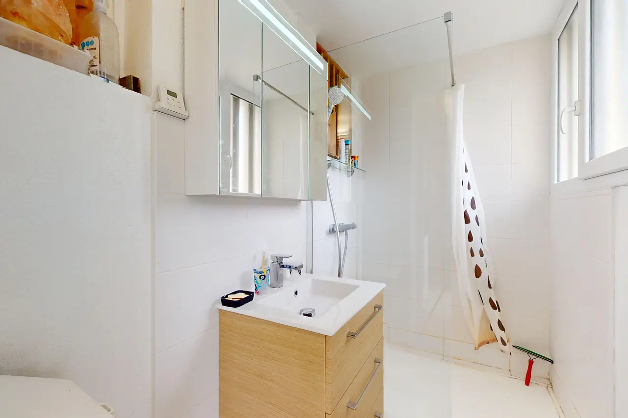 La première salle de bain dispose d'une baignoire, d'un meuble vasque avec un miroir ainsi que d'un lave-linge. La salle d'eau se compose d'une grande douche, d'un sèche-serviettes ainsi que d'un meuble vasque avec un miroir.