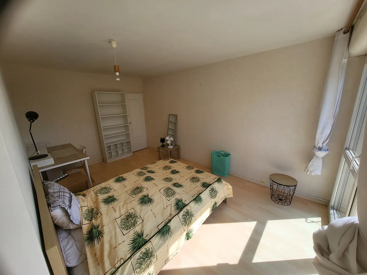 La chambre est équipée d'un bureau, d'un lit et de rangements.