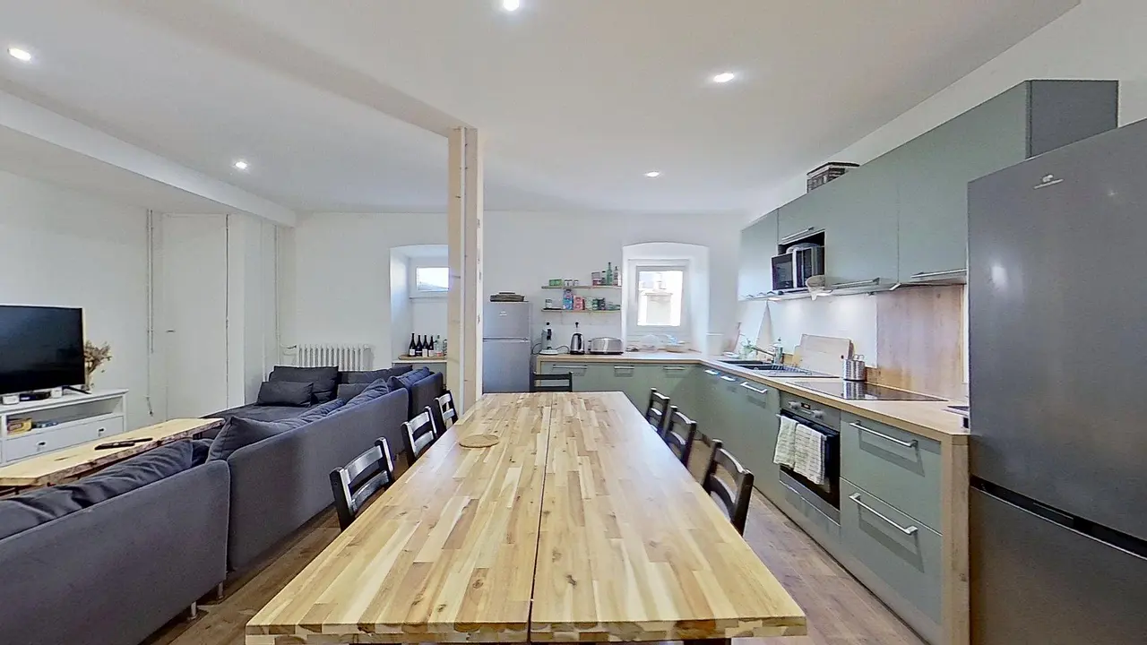 Cette colocation de sept chambres s'ouvre sur une grande pièce de vie aménagée avec un grand canapé d'angle, d'une table basse, un meuble TV avec une télévision, deux armoires ainsi que d'une grande table avec huit chaises, idéal pour partager des repas entre colocataires.