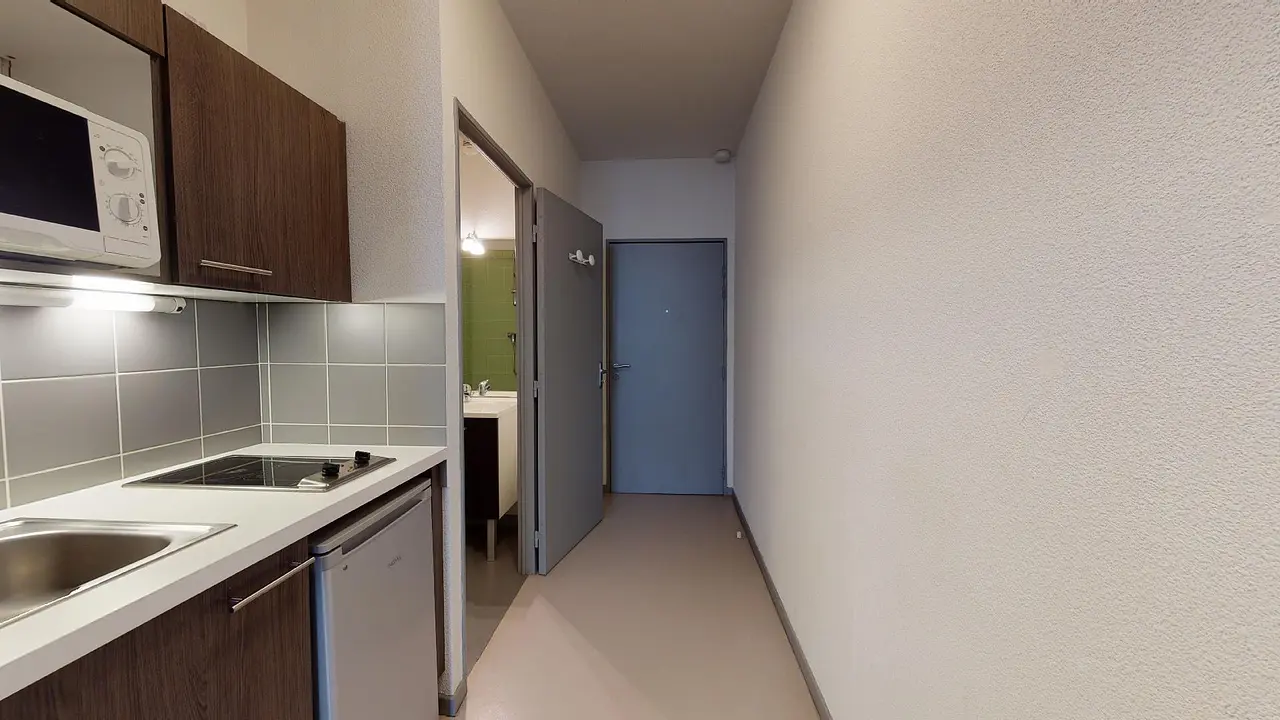 Ce studio est parfaitement aménagé : un bureau, un lit simple et un grand placard de rangement ainsi qu'une commode composent la pièce de vie. La cuisine comporte un réfrigérateur, des plaques de cuisson, un mini-four ainsi que de nombreux rangements et tout le nécessaire pour prendre et préparer les repas.