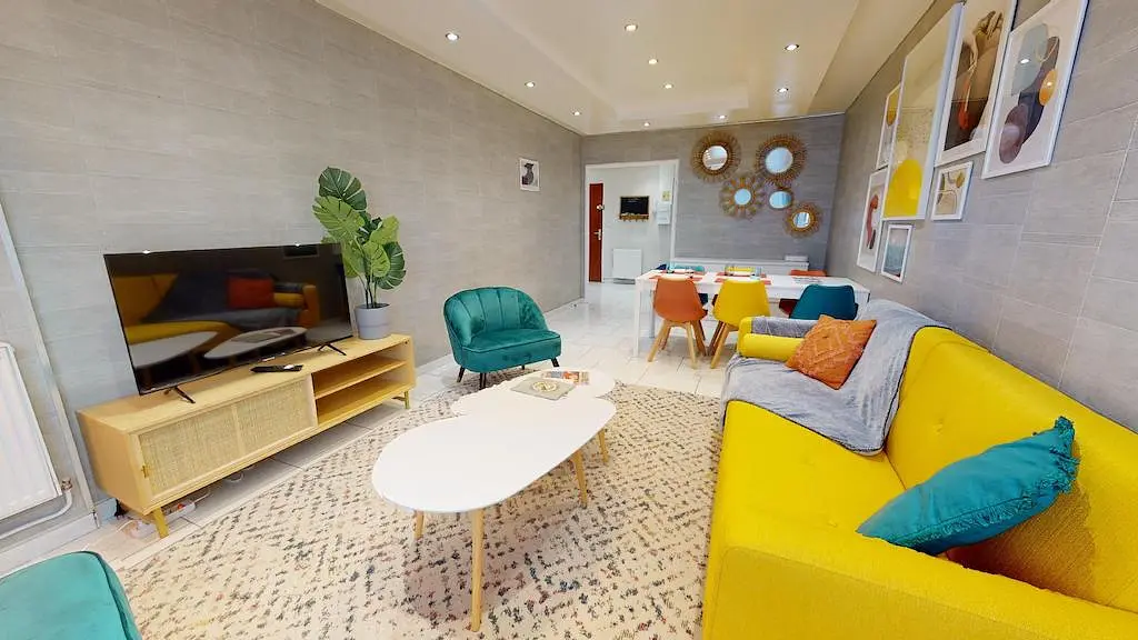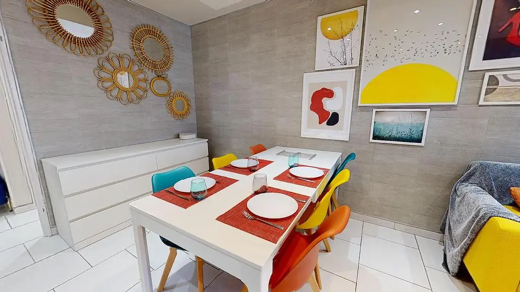 Le salon coloré et chaleureux offre un coin salle à manger avec un buffet, une table et six chaises, idéal pour partager des repas entre colocataires. Le coin salon est disposé avec un canapé, deux tables basses, deux fauteuils, un tabouret, un meuble TV et une télévision ainsi que plusieurs éléments de décoration.