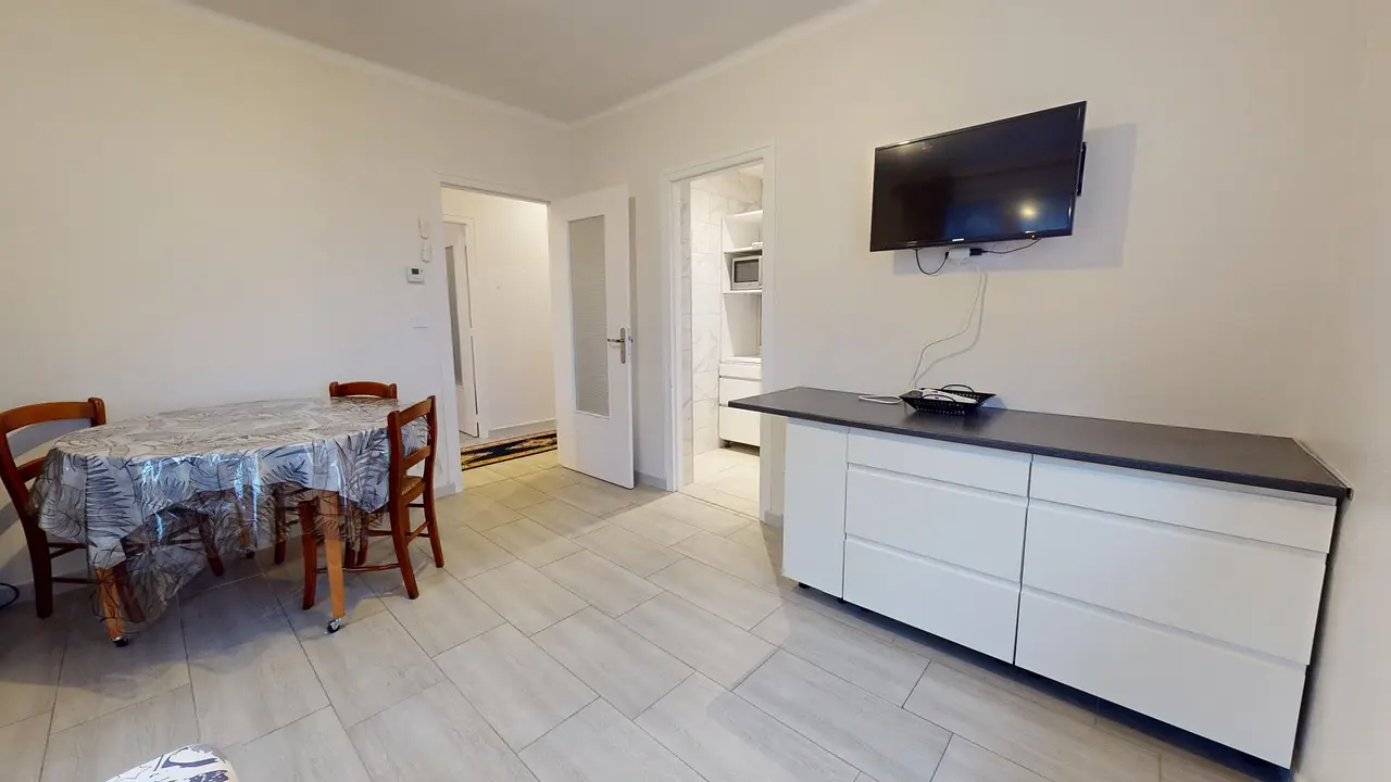 Cette colocation de trois chambres s'ouvre sur une entrée avec un meuble à chaussures et un placard mural. Le séjour est aménagé d'une table avec trois chaises, un réfrigérateur, un BZ, un meuble de rangements ainsi que d'une télévision.