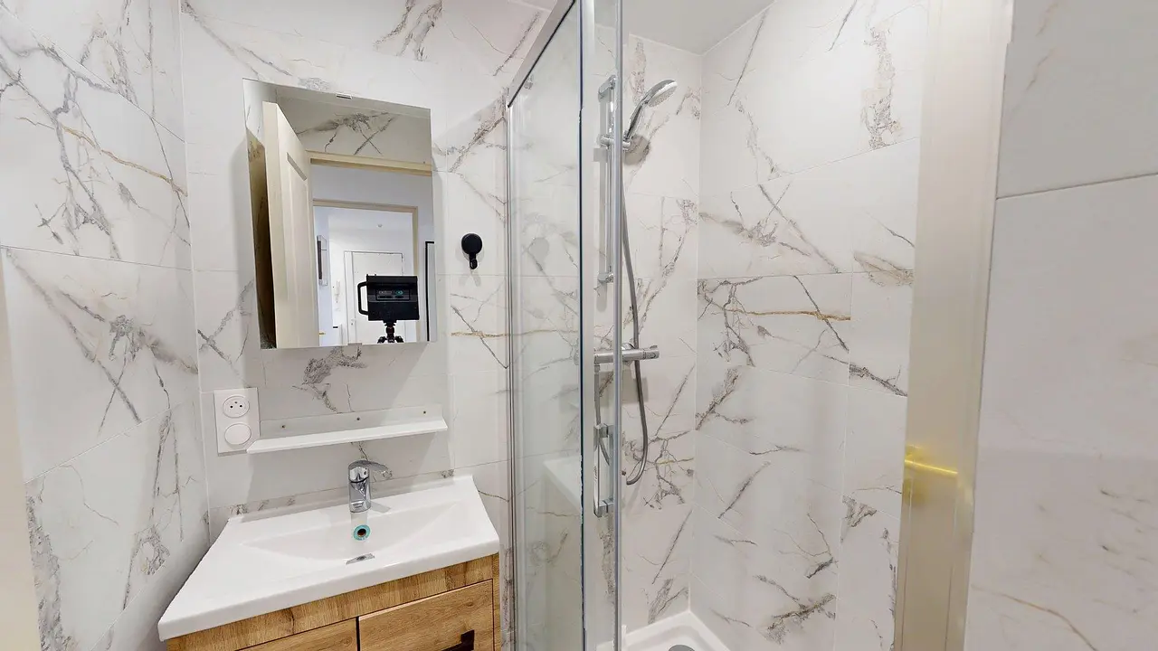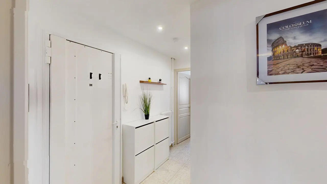 L’appartement s’ouvre sur une entrée fonctionnelle, équipée d’un meuble à chaussures, parfaite pour l’organisation. Un petit dégagement avec commode et placards de rangement permet de stocker vestes et effets personnels. Les WC sont séparés et disposent d’un meuble vasque avec point d’eau, un confort appréciable au quotidien.