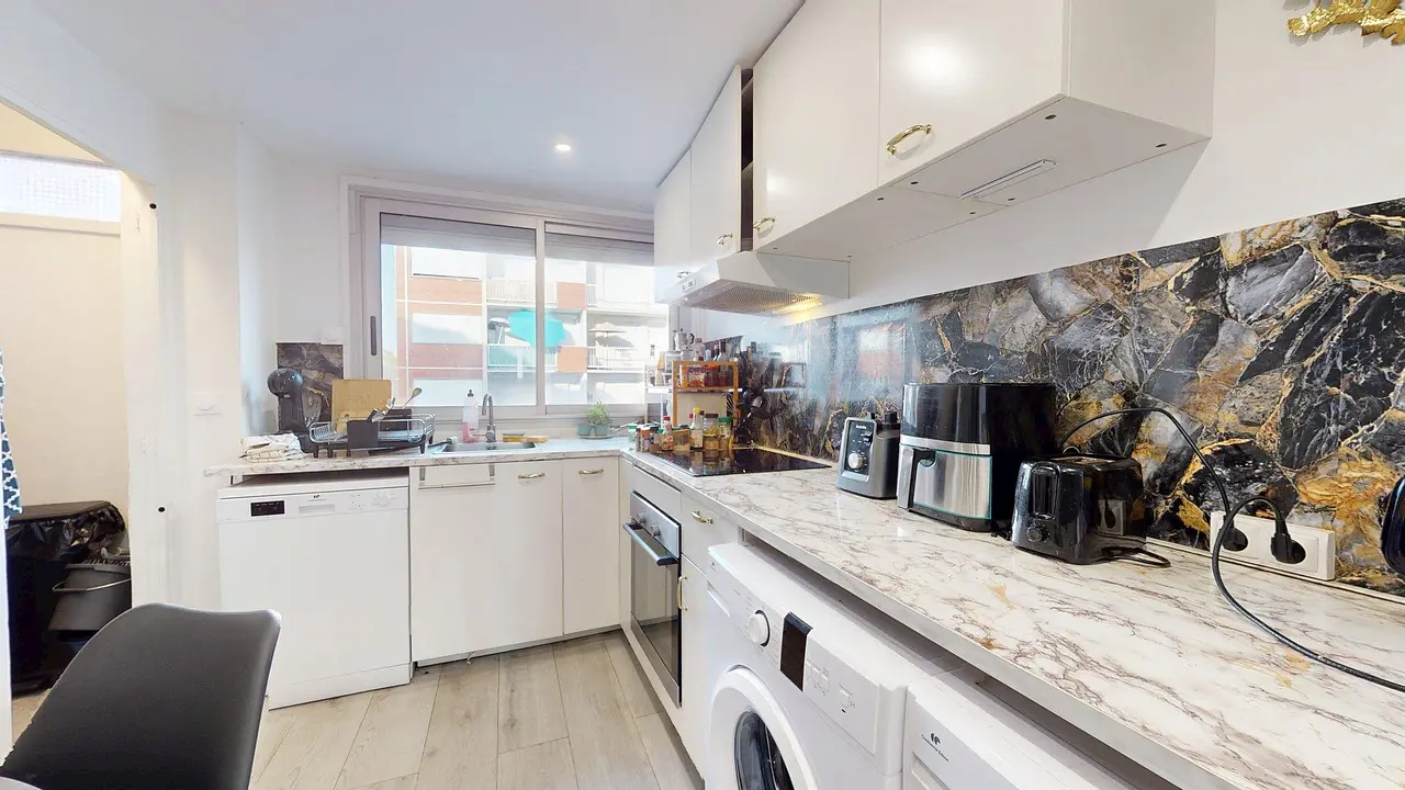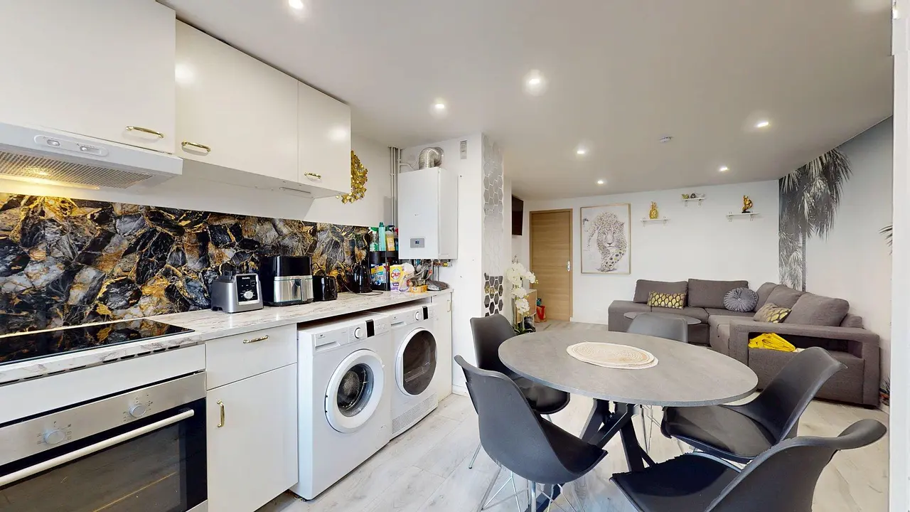 La cuisine ouverte est équipée d'un réfrigérateur congélateur, d'un lave-vaisselle, d'une machine à café, d'un évier avec égouttoir, d'un four, de plaques de cuisson avec une hotte, d'un air-fryer, d'une machine à laver, d'un sèche-linge, d'un grille-pain, d'une bouilloire ainsi que de nombreux rangements.