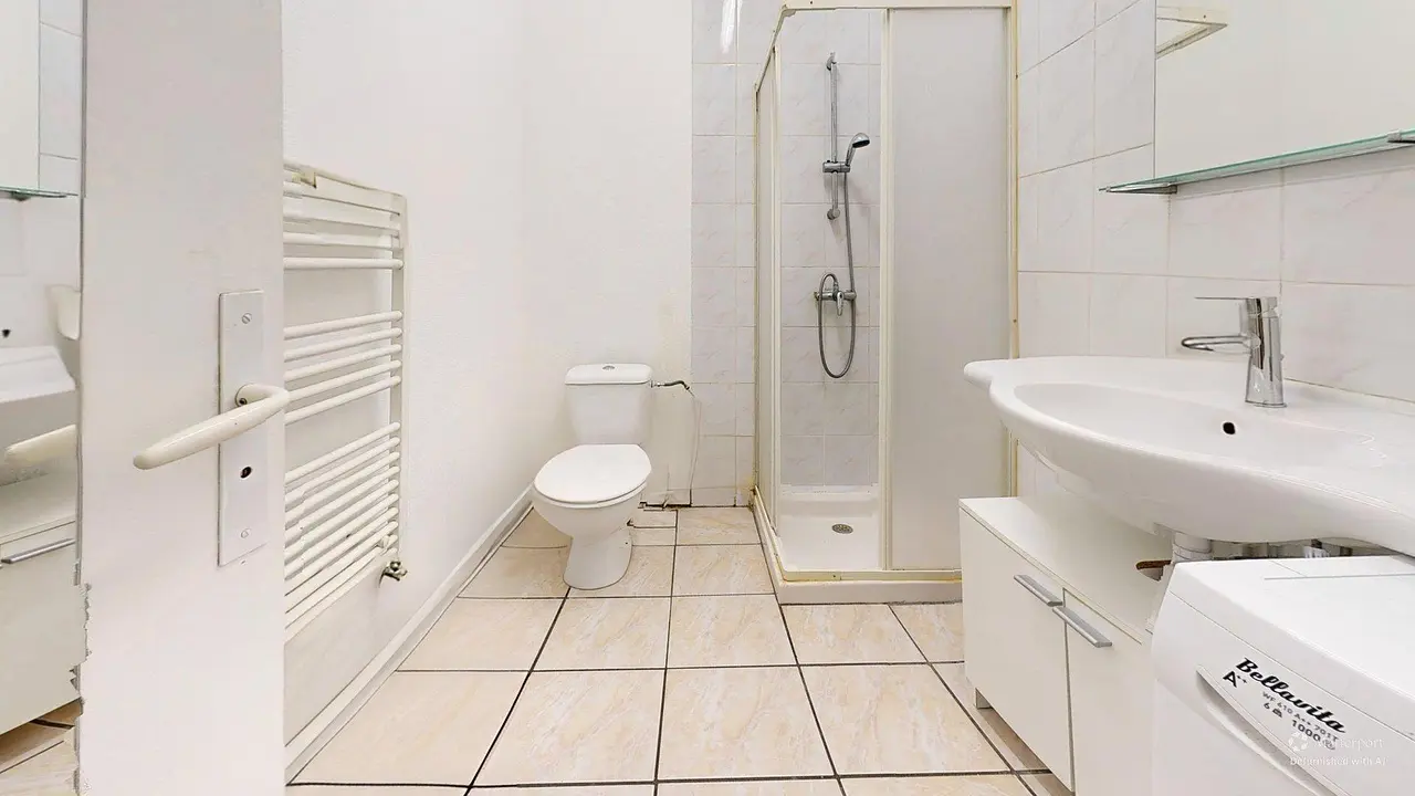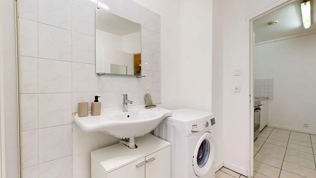 La salle de bain comprend une douche, un meuble vasque avec miroir, une machine à laver, un sèche-serviettes ainsi que des WC intégrés.