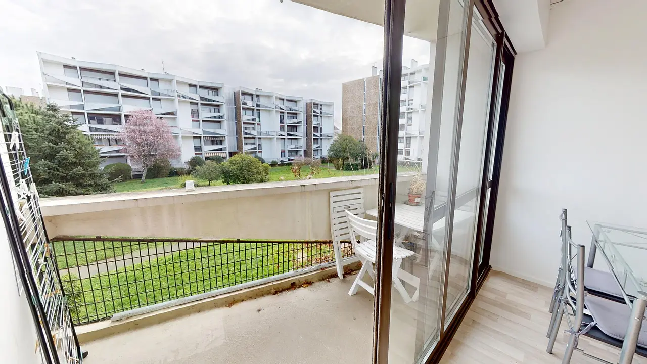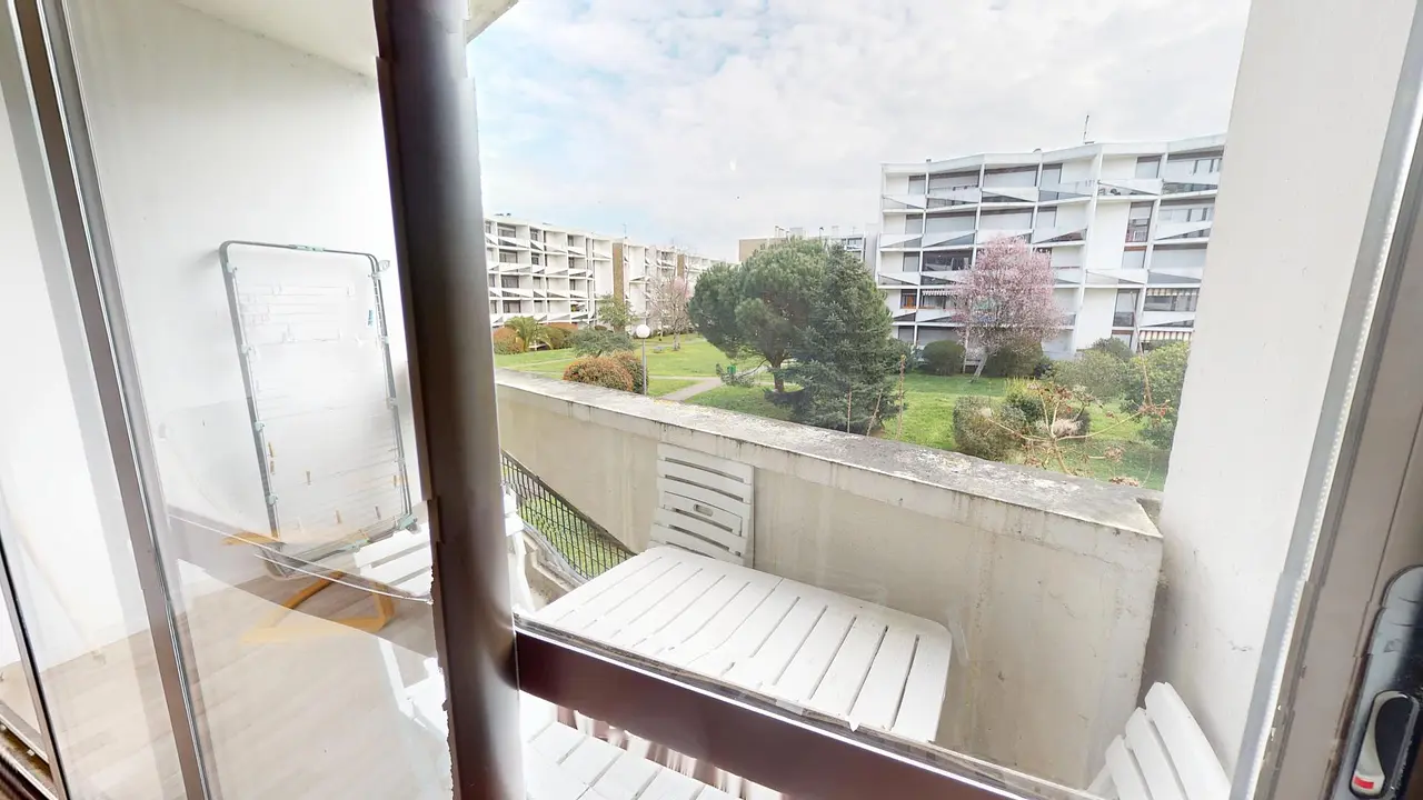 La pièce donne sur un balcon équipé de mobilier d'extérieur pour profiter des beaux jours en toute tranquillité.