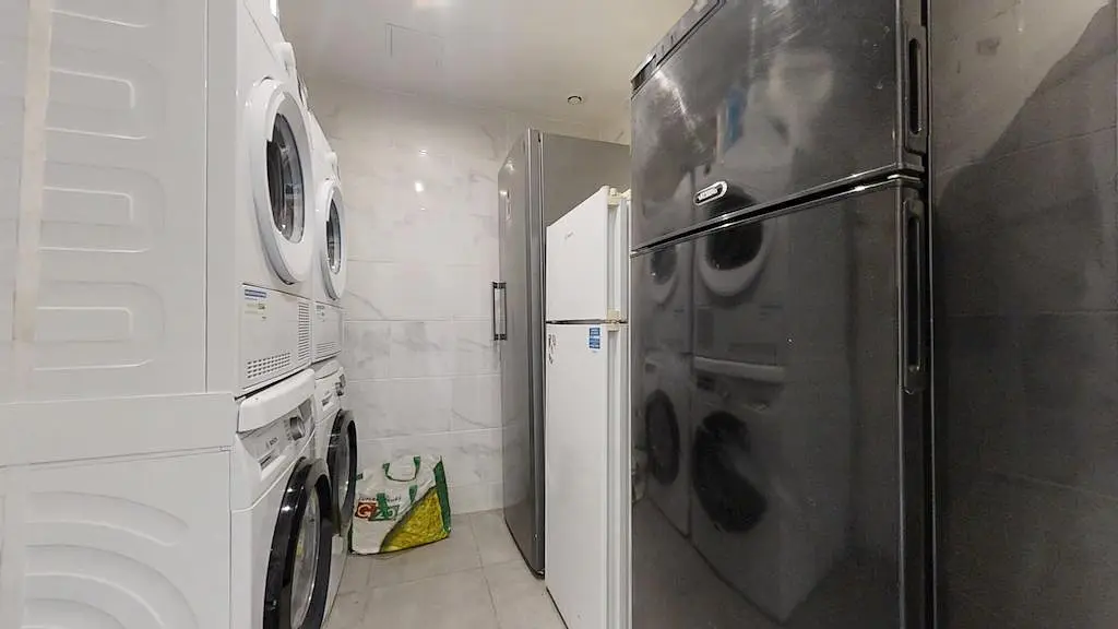 Une buanderie complète les espaces communs avec plusieurs lave-linges ainsi que des réfrigérateurs supplémentaires pour optimiser l’espace.