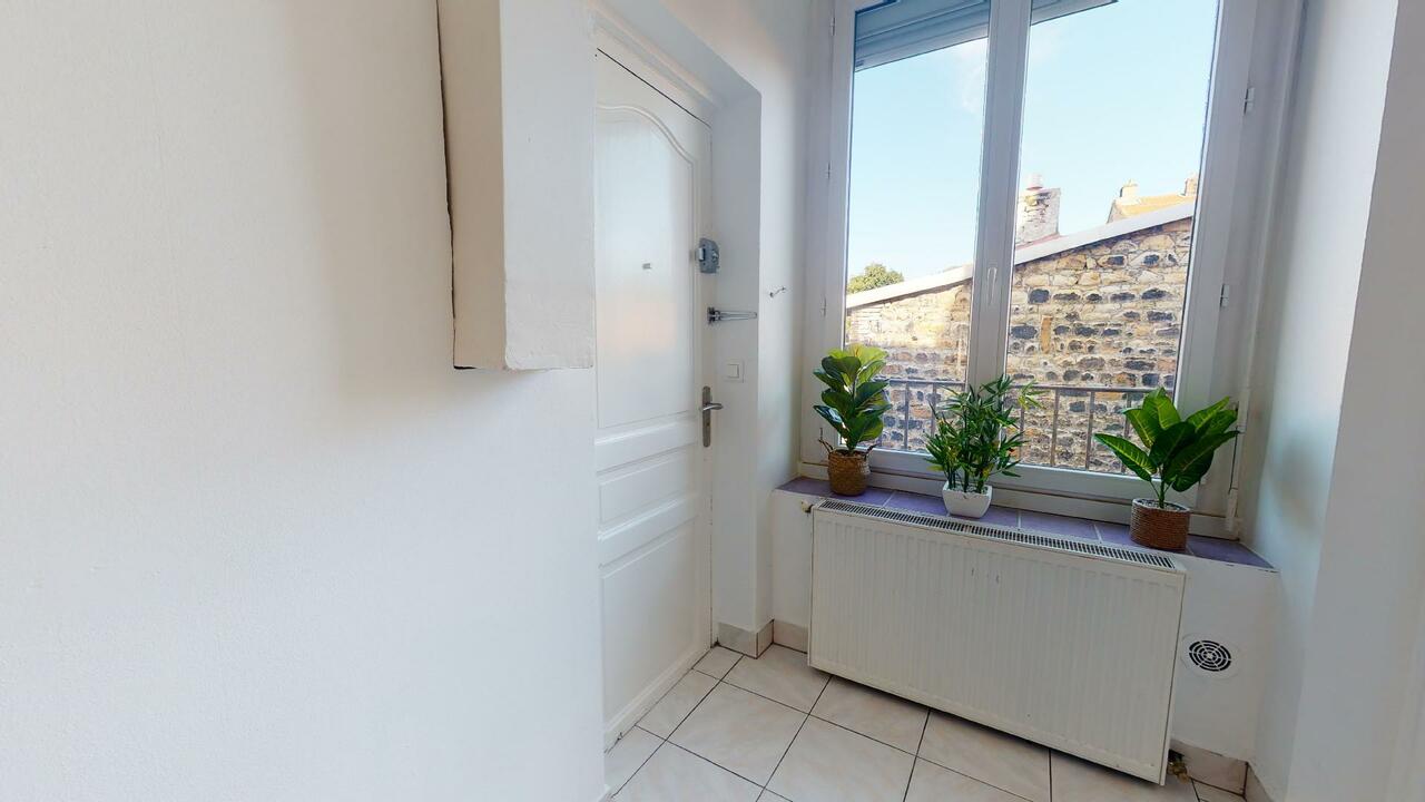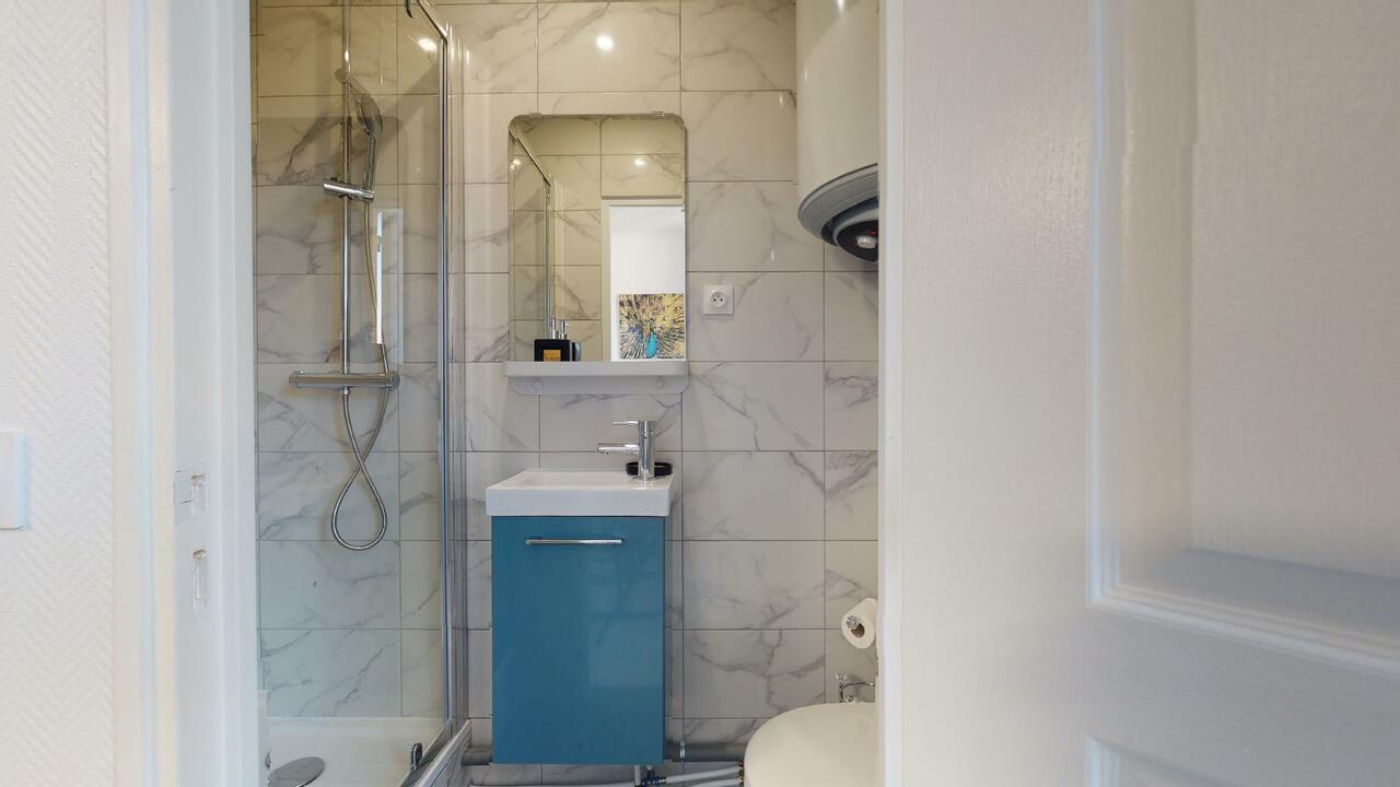 La colocation s'ouvre sur un couloir donnant accès à la salle de bain, et amenant sur une cuisine ouverte avec bar mange-debout. La salle de bain est équipée avec douche, meuble vasque et sèche serviette.