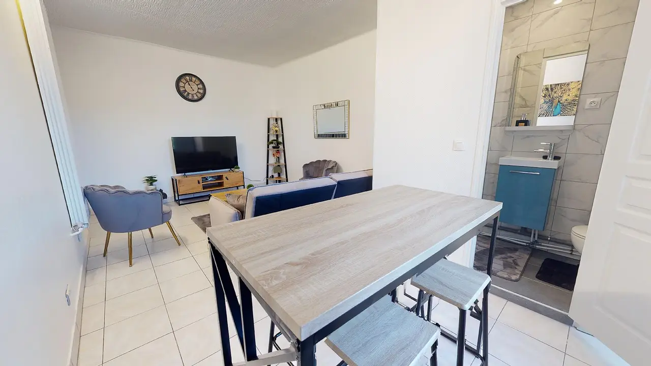 La pièce de vie à la décoration moderne et industrielle est idéalement meublée avec canapé, fauteuil, TV et meuble TV, table basse, rangements ainsi qu'une table à manger pour tous les colocataires. Une deuxième salle de bain avec WC est accessible depuis ce salon.