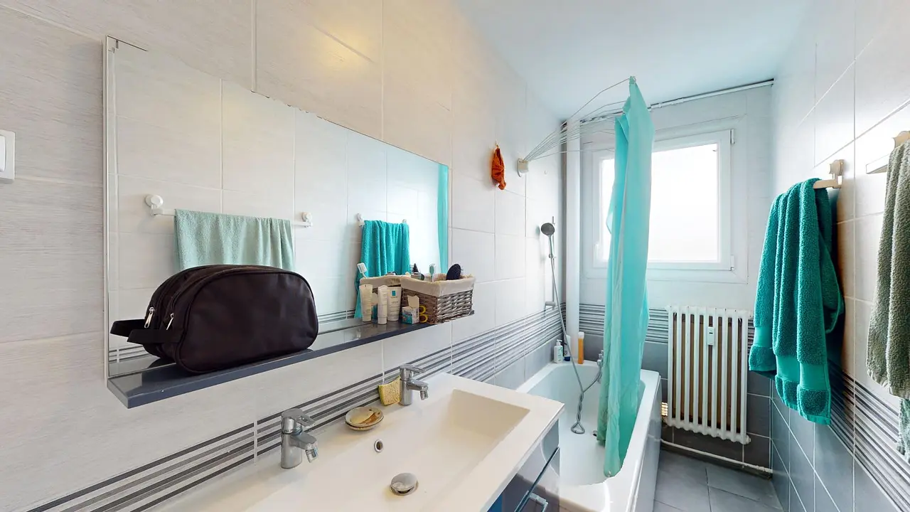 La salle de bain dispose d'une baignoire, de portes serviettes, d'un grand meuble vasques avec un miroir ainsi que d'une machine à laver. Les toilettes sont séparées.