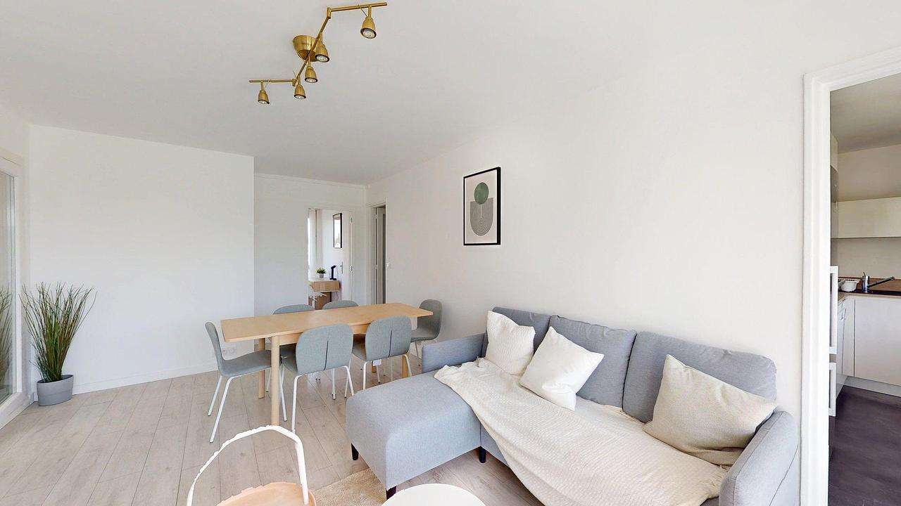 L’appartement offre une pièce de vie lumineuse et chaleureuse, meublée avec un canapé confortable, une table basse, un meuble TV avec écran plat, ainsi qu’un coin repas avec table et chaises. Une baie vitrée apporte une belle luminosité naturelle et donne accès à une loggia.