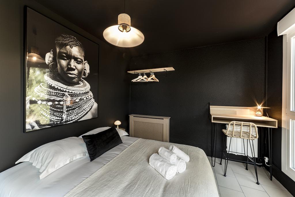 La chambre est équipée d'un bureau, d'un canapé, d'un lit, d'une penderie et d'un placard. La cuisine est meublée d'un meuble de rangement. Elle comporte aussi un four, un lave-vaisselle, une machine à café, un micro-ondes et une plaque de cuisson.