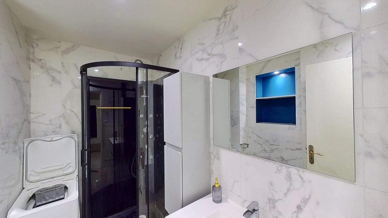 La salle de bain est équipée d'une douche, d'un meuble vasque, d'un WC et d'un lave-linge.