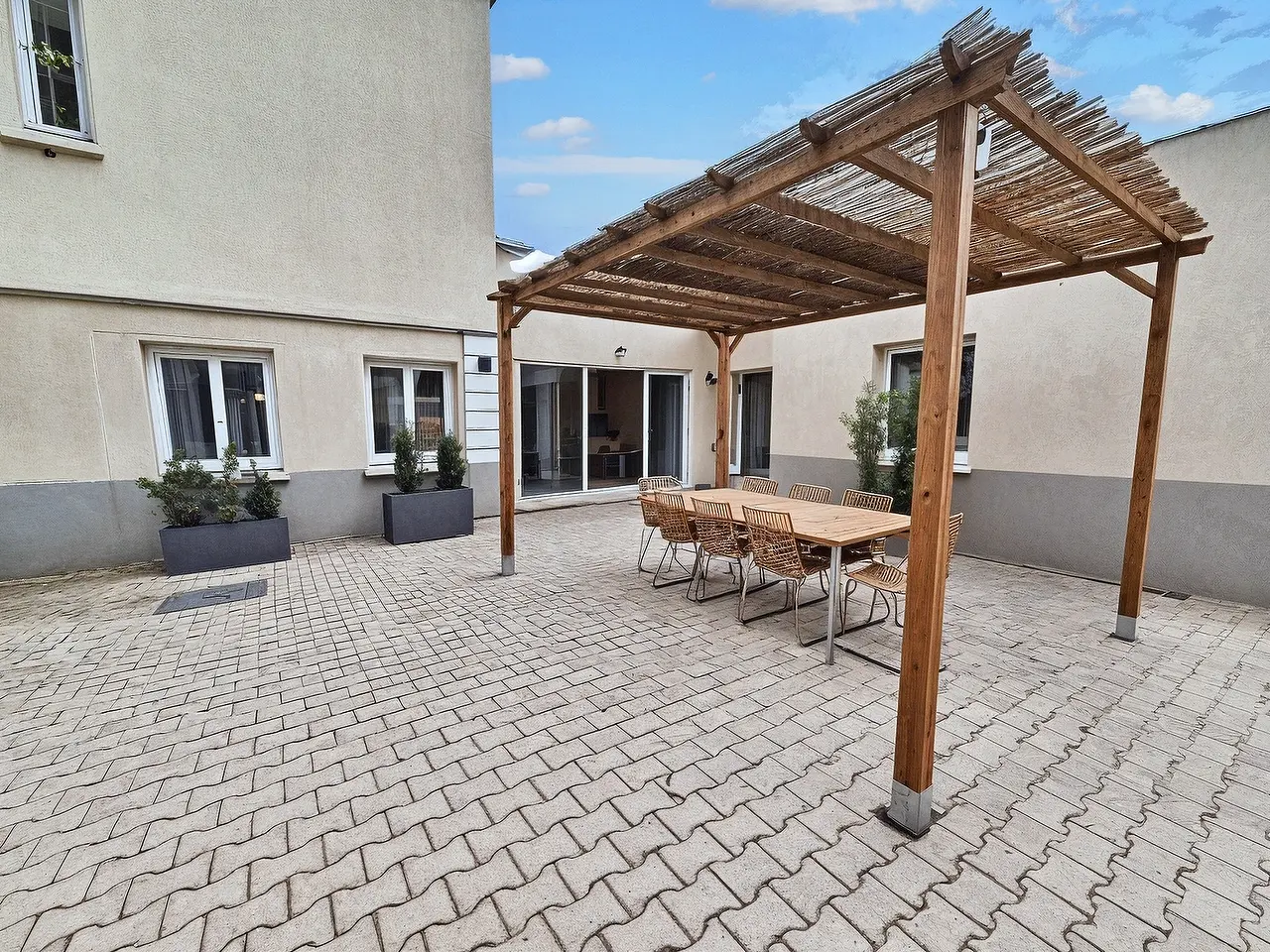 Cet espace de coliving est agrémenté d'une cour intérieure, bientôt arborée, disposant d'une table à manger et de sept chaises.