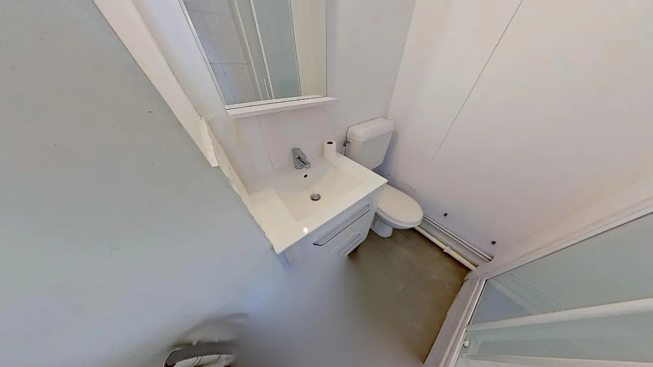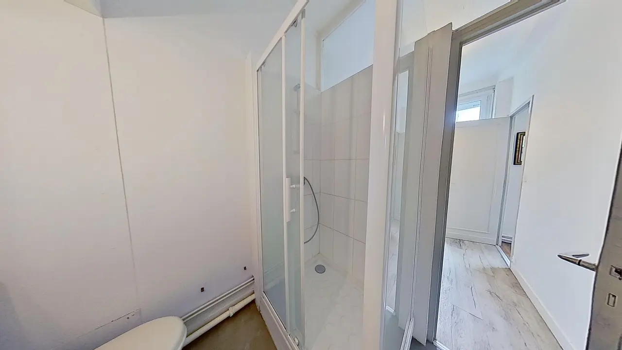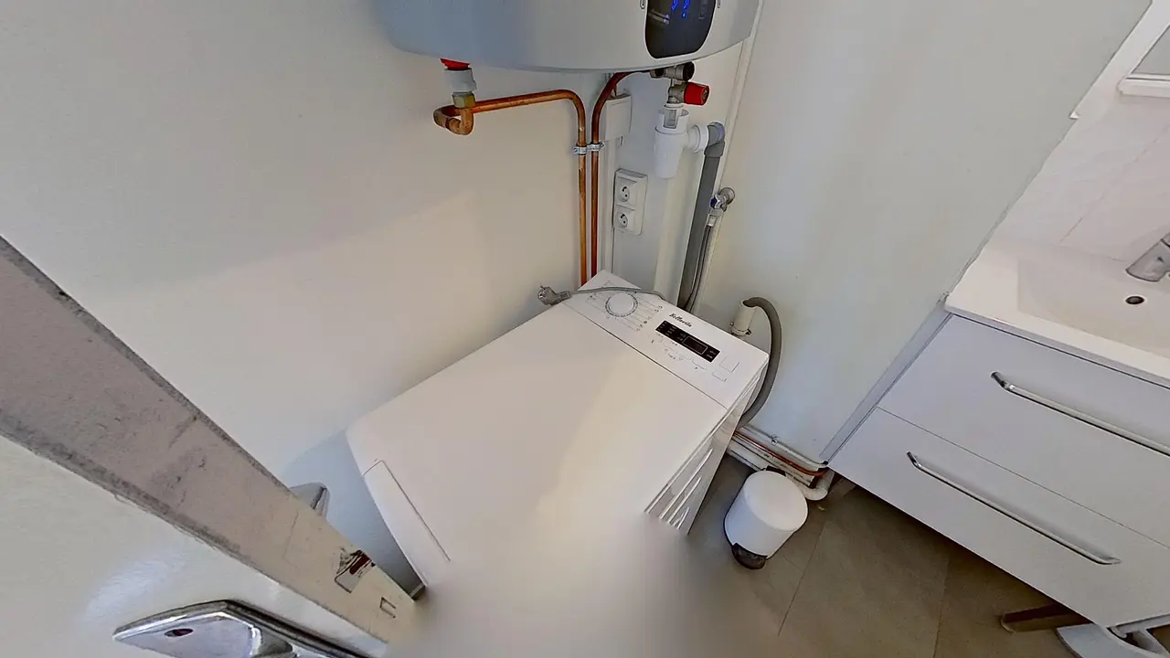 La salle d'eau comporte une cabine de douche, un meuble vasque, des WC et une machine à laver.