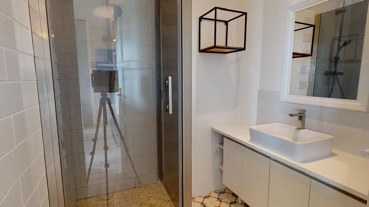 La salle de bain possède une douche et un meuble vasque avec plusieurs rangements pour vos produits.