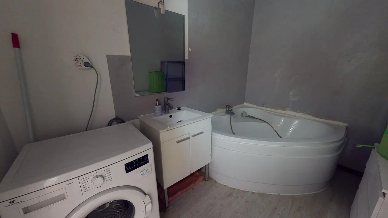 La salle de bain est équipée avec machine à laver, meuble vasque, baignoire esprit "jacuzzi", sèche serviette et de nombreux rangements.