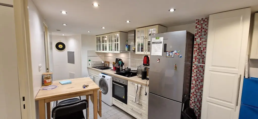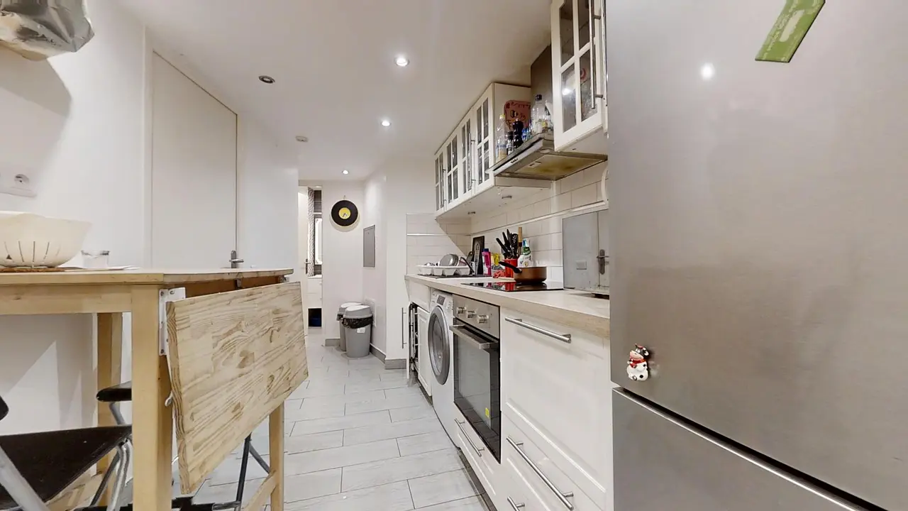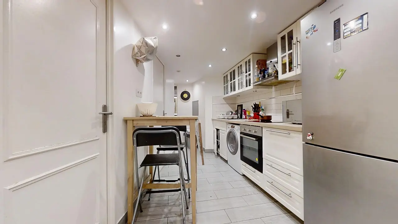 Les parties communes comprennent une cuisine entièrement équipée : frigo, micro-ondes, four, machine à laver séchante, table à manger, plaques de cuisson, rangements, etc.