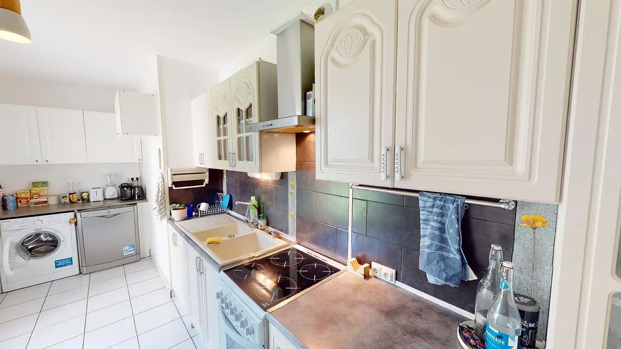d’un lave-vaisselle, d’une machine à laver, ainsi que de plusieurs placards de rangement.