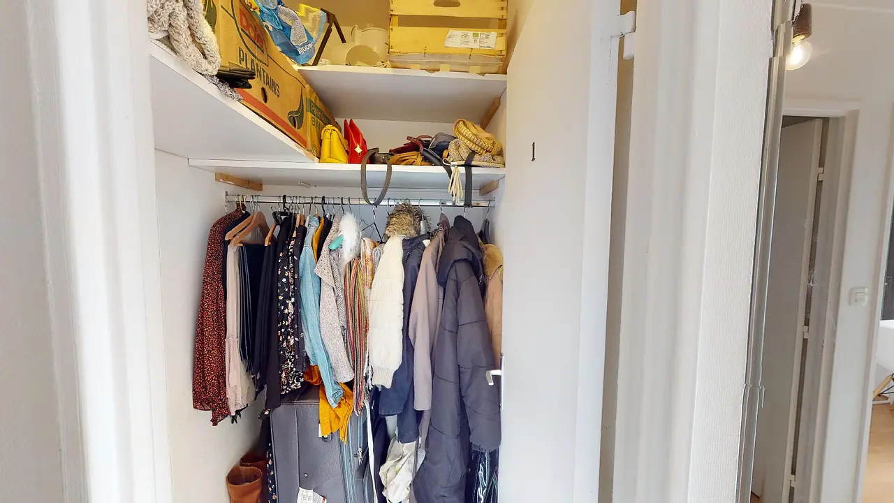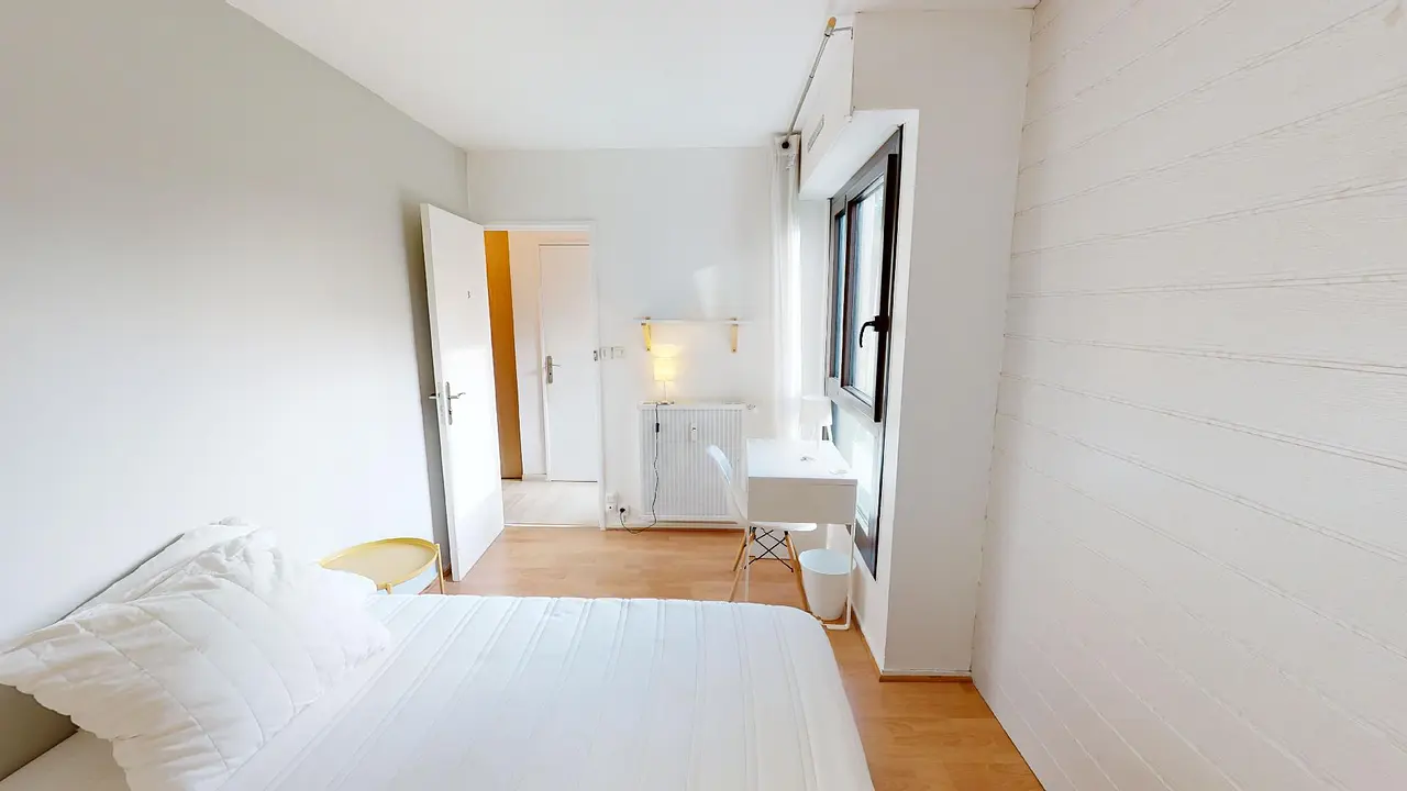 La chambre est louée avec un bureau, un lit, une penderie et un placard.