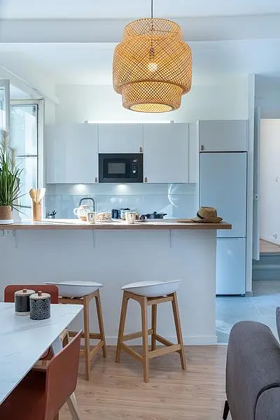 Cet appartement a été entièrement rénové début 2023 pour offrir un cadre de vie moderne et chaleureux dans un esprit coliving. La pièce de vie principale se compose d'un salon cosy avec un canapé, un pouf et une large table basse, s'ouvrant sur une cuisine américaine parfaitement agencée. Cet espace dispose d'un comptoir avec tabourets de bar, de nombreux rangements et d'un équipement complet incluant un lave-vaisselle, un four, un micro-ondes et un réfrigérateur avec un grand compartiment congélateur. La distribution du bien permet d'accéder à une première chambre depuis le séjour, tandis que deux marches mènent à un couloir desservant les deux autres chambres ainsi qu'une salle de bain équipée d'une machine à laver. Le chauffage et la production d'eau chaude sont assurés par des équipements performants pour garantir un confort optimal toute l'année.