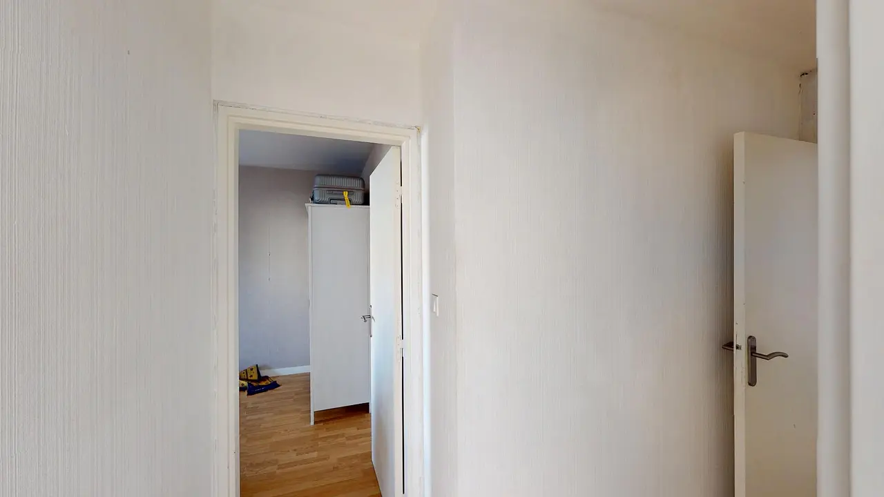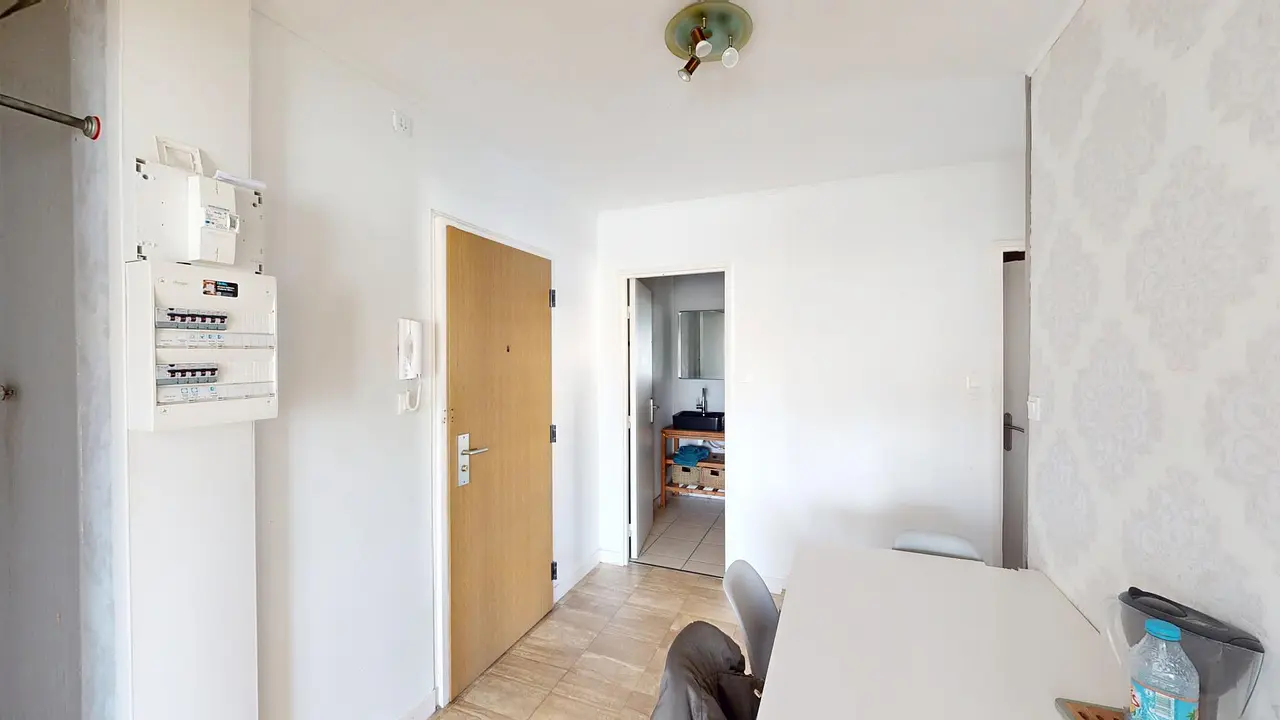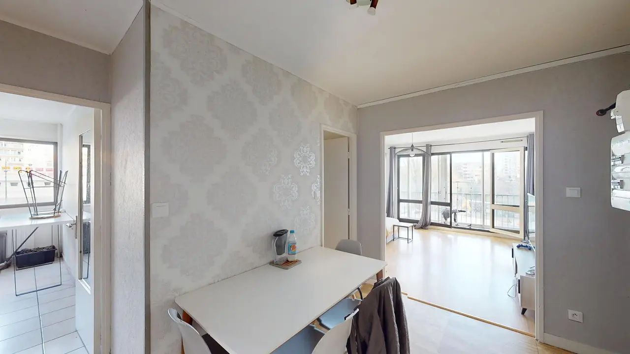 Cette colocation de quatre chambres s'ouvre sur un dégagement avec une table et quatre chaises. Le séjour est aménagé d'un canapé d'angle, d'une table basse ainsi que d'un meuble TV avec une télévision.