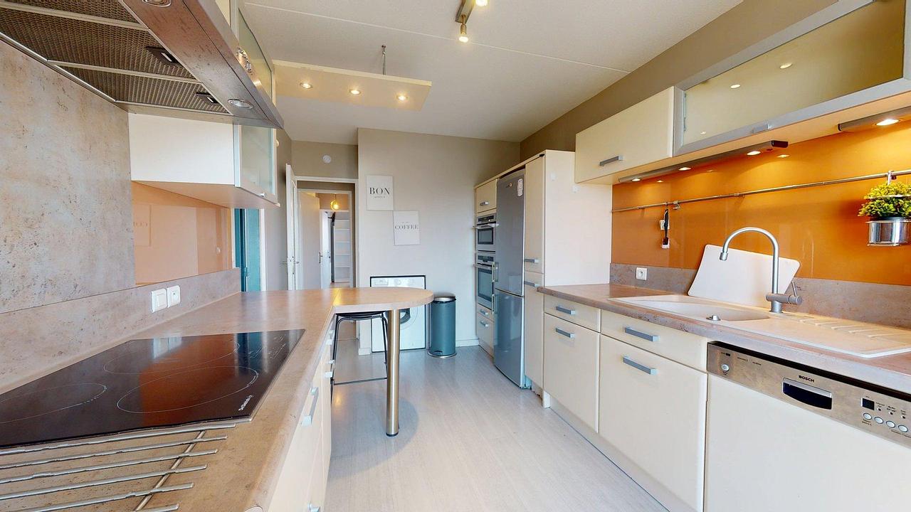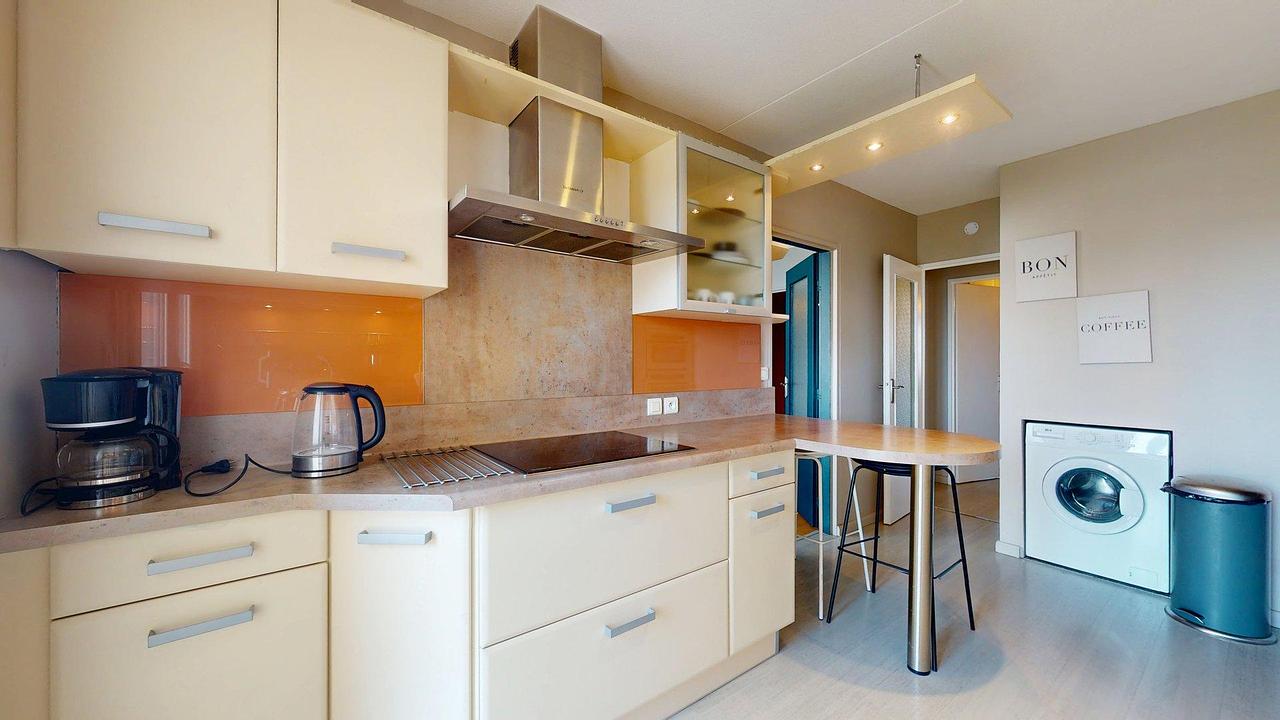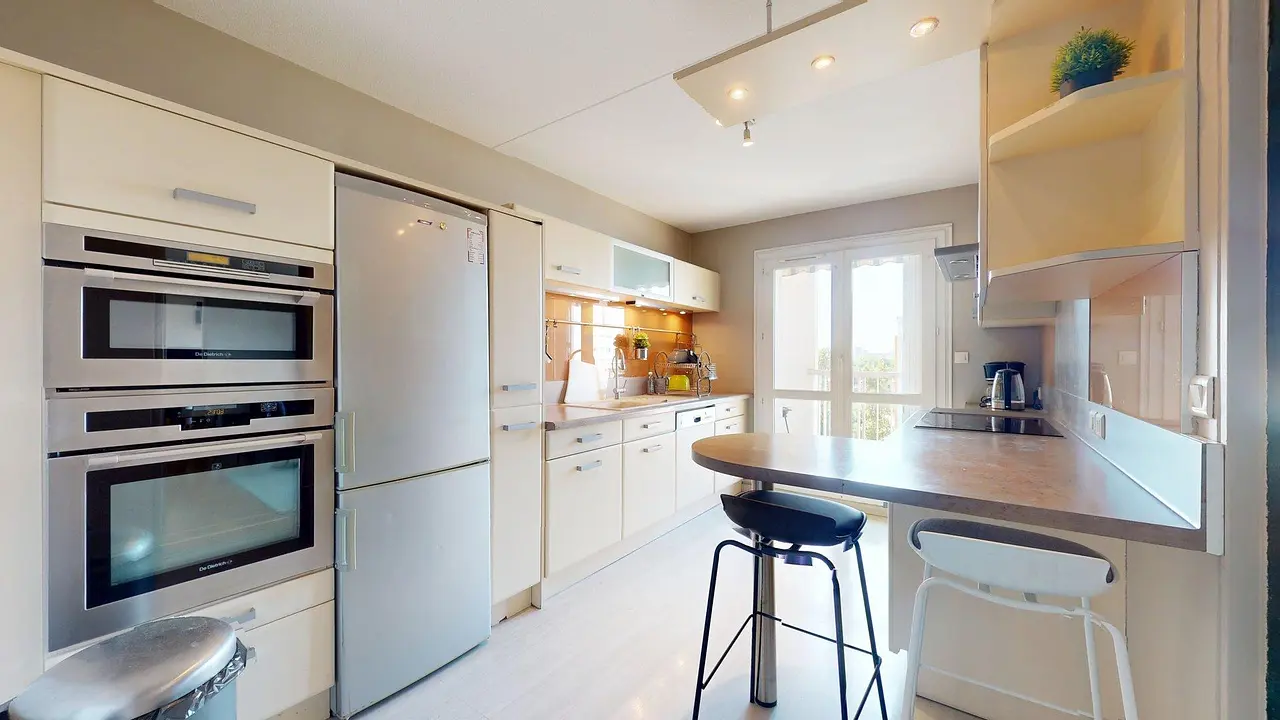 Vous découvrirez ensuite une belle cuisine équipée d’un grand frigidaire, de plaques de cuisson, d’un four, d’une hotte, d’un micro-ondes, d’un lave-linge, d’un lave-vaisselle, ainsi que d’une table haute avec deux chaises de bar.