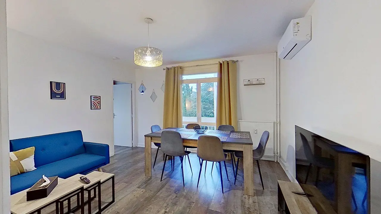 L’appartement dispose d’un séjour spacieux et lumineux, aménagé avec un coin salon confortable, une grande table à manger et une télévision, idéal pour partager des moments conviviaux entre colocataires.