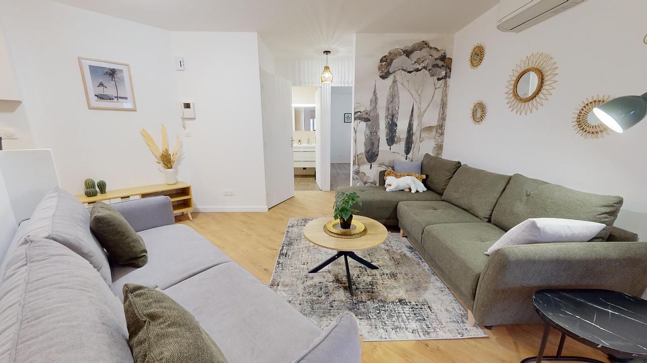 Le salon dispose de deux canapés, un meuble TV et une table basse.