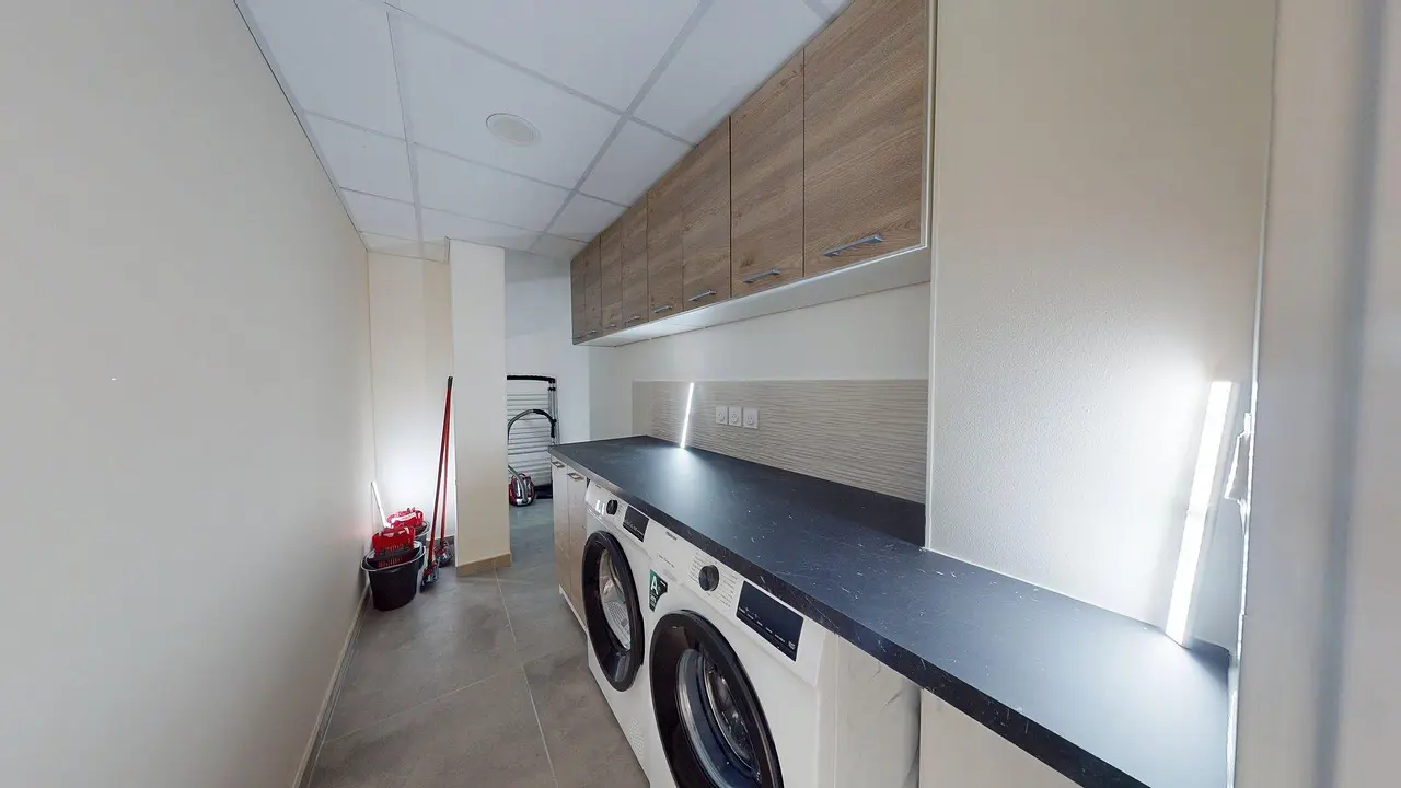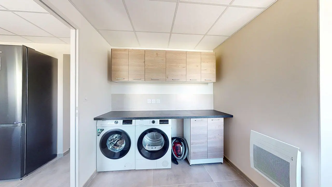 Les buanderies sont équipées d'un lave-linge, d'un sèche-linge ainsi que de nombreux rangements.