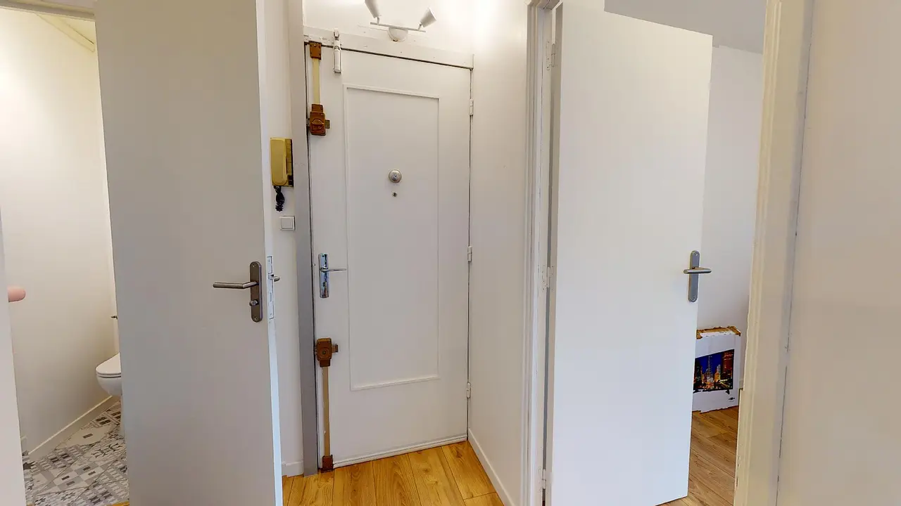 La porte d’entrée de cette colocation s’ouvre sur un sas d’entrée qui dessert notamment les WC séparés et la salle de bain avec grande douche et meuble vasque.