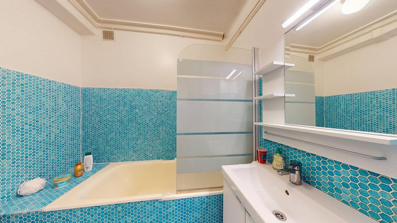 La salle de bain, équipée d’une baignoire et d’un meuble vasque récent, présente un carrelage bleu rétro qui lui donne un charme unique. Les WC sont séparés.