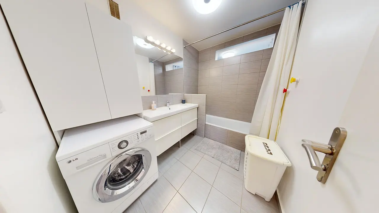 La salle d’eau comporte une baignoire, un meuble vasque avec miroir, une machine à laver ainsi que des rangements.