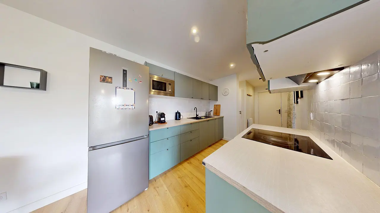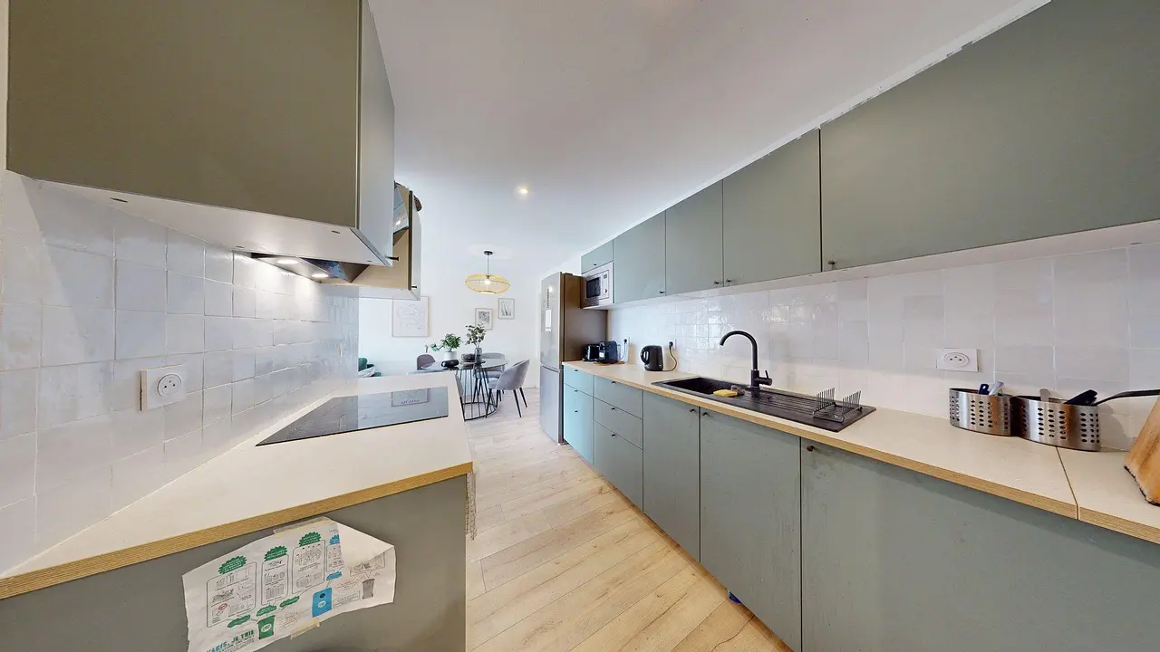 La cuisine, moderne et entièrement équipée, dispose de plaques de cuisson, d’une hotte, d’un évier, d’un réfrigérateur, d’un four, d’un micro-ondes ainsi que de nombreux rangements et ustensiles indispensables au quotidien.